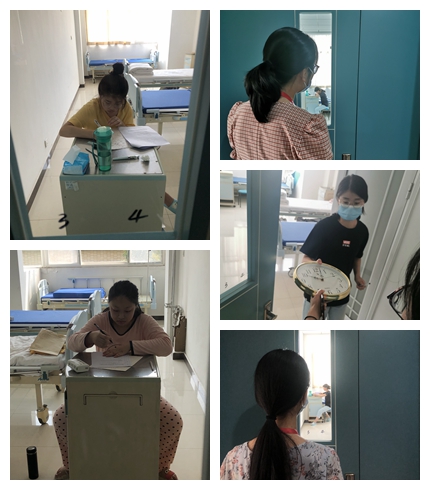 每场考试开考前半个小时,各位监考老师都会领取密封好的试卷,到达特殊考场后,监考老师仔细检查学生病房里的临时书桌,查验学生证,确保考试流程无误。考试期间,监考老师坚守在“考场”门口,考场纪律丝毫不打折扣。在老师们的共同努力下,三名隔离学生顺利完成各科目考试。