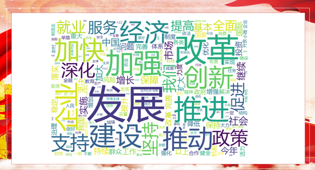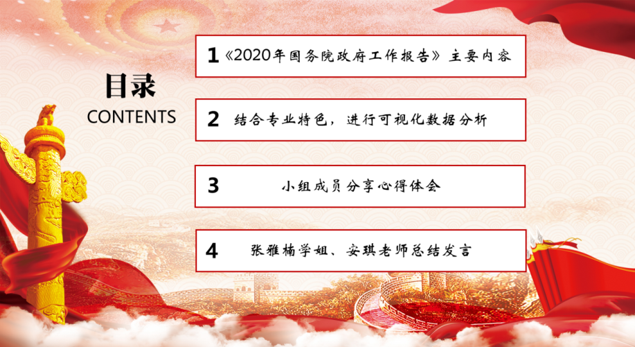 首先,刘国伟带领大家学习解读了《2020年国务院政府工作报告》的主要内容,他将报告的八个部分浓缩为两点,分别从 “2019年和今年以来工作回顾”和“今年发展主要目标和下一阶段工作总体部署”进行讲解展示,并结合计算机的专业优势,通过数据分析统计对报告中的专有名词进行讲解,结合词云和柱形图进行直观展示,帮助大家理解记忆。