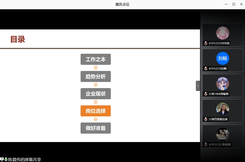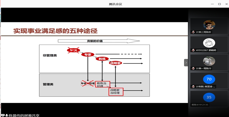 为引导非师范本科生明确职业分类,了解专业发展现状及前景,提前做好个人发展规划,6月7日晚7时,必赢官网本科生举行了“职业分类与专业发展”主题线上指导课程。必赢官网党委副书记袁冰、副院长马苗和联想战略总监陈景伟受邀出席,2019级计算机类全体同学以及部分2017、2018级本科生共计两百余人参加了本次会议,会议由2019级辅导员崔瑜璠主持。