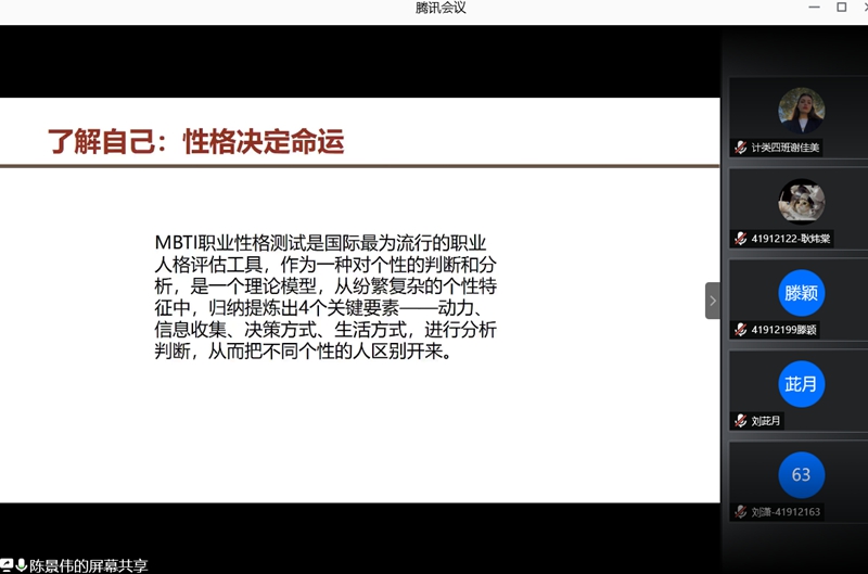 最后,崔瑜璠对陈景伟的分享表示了感谢,并且鼓励同学们善于思考,认真学习,加强对自己的管理,在学习实践中提高自己的综合素质。认清自己,了解自己,知道自己的短板,了解自己的优点,弥补短板发扬优点,在大学生活中,不断锻炼自己,做好职业规划,提升自身在求职就业中的竞争优势。