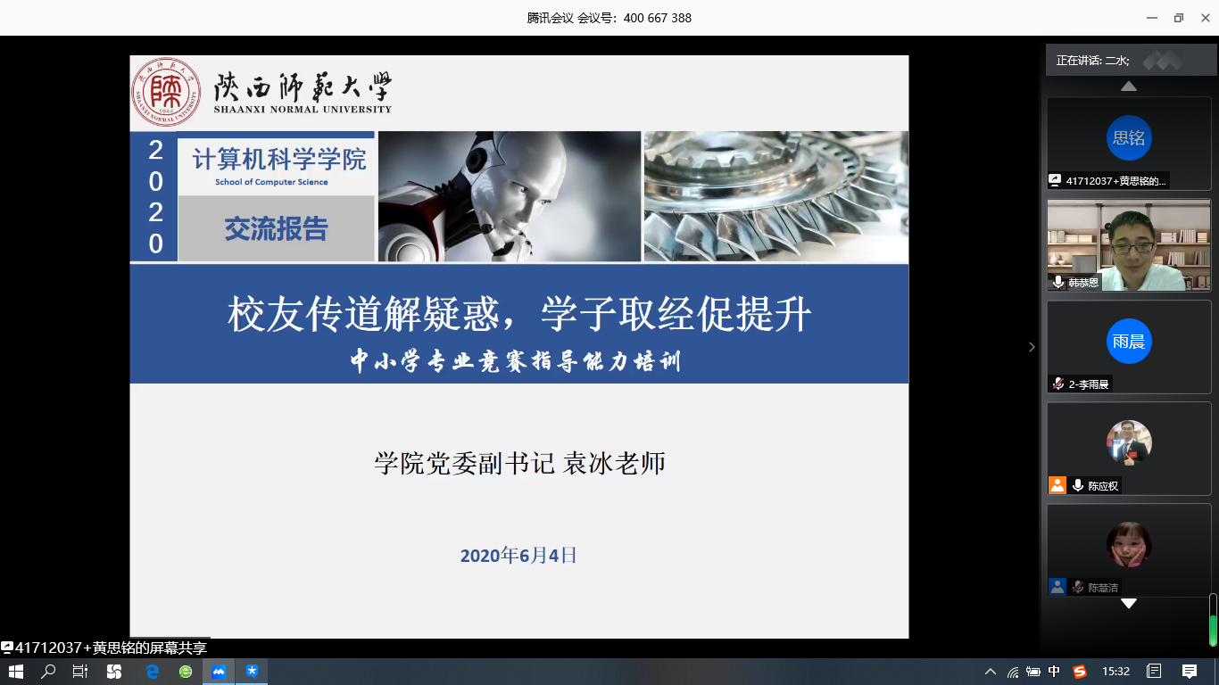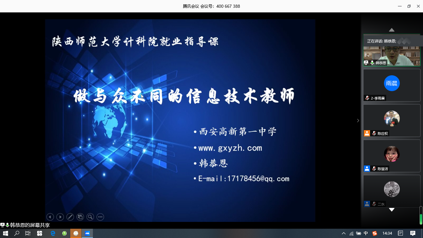 6月4日下午,必赢官网2017级本科生就业指导课之“做与众不同的信息技术教师”顺利开课,本次指导课特别邀请到必赢官网2002届计算机科学与技术专业优秀校友韩恭恩老师为大家做分享。学院党委副书记袁冰、2017级计算机科学与技术师范专业全体本科生参加了本次就业指导课,就业指导课由2017级本科生辅导员陈应权主持。