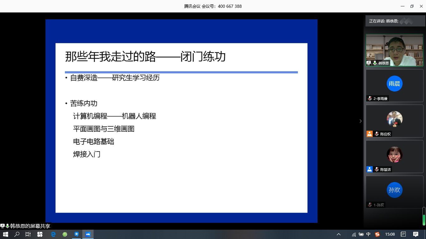 韩恭恩老师向同学们介绍了人工智能目前的发展情况和对社会的重要影响,他认为作为计算机专业的学生应该充满专业自信,也应该对自己的未来充满信心。韩老师强调,除了本职的基础课程教学工作以外,每个人都应该有自己的特色和爱好,要学会根据自己的特色找到自己的突破点,使之成为自己的特色内容。作为中小学信息技术教师,可以利用自己的专业优势,带领学生在校内开展一些相关的科技活动,例如机器人社团、信息学奥赛、航模社团、木工建模等。在讲授了一系列信息技术教师相关的专业知识后,韩恭恩老师结合自身的工作经历,告诉大家在走上社会之后,会面临许多机遇和挑战,也会有过迷茫和彷徨,但不论是小有成就还是闭门练功的阶段,都应该坚定地走自己想走的路,并为之付出努力,坦诚对待他人,尊重对手,提升自己。“厚德载物、天道酬勤”,只要不断进取、努力提升自己的能力,都将在自己热爱的工作岗位上发光发热。随后,韩恭恩老师针对同学们的提问进行了答疑。
