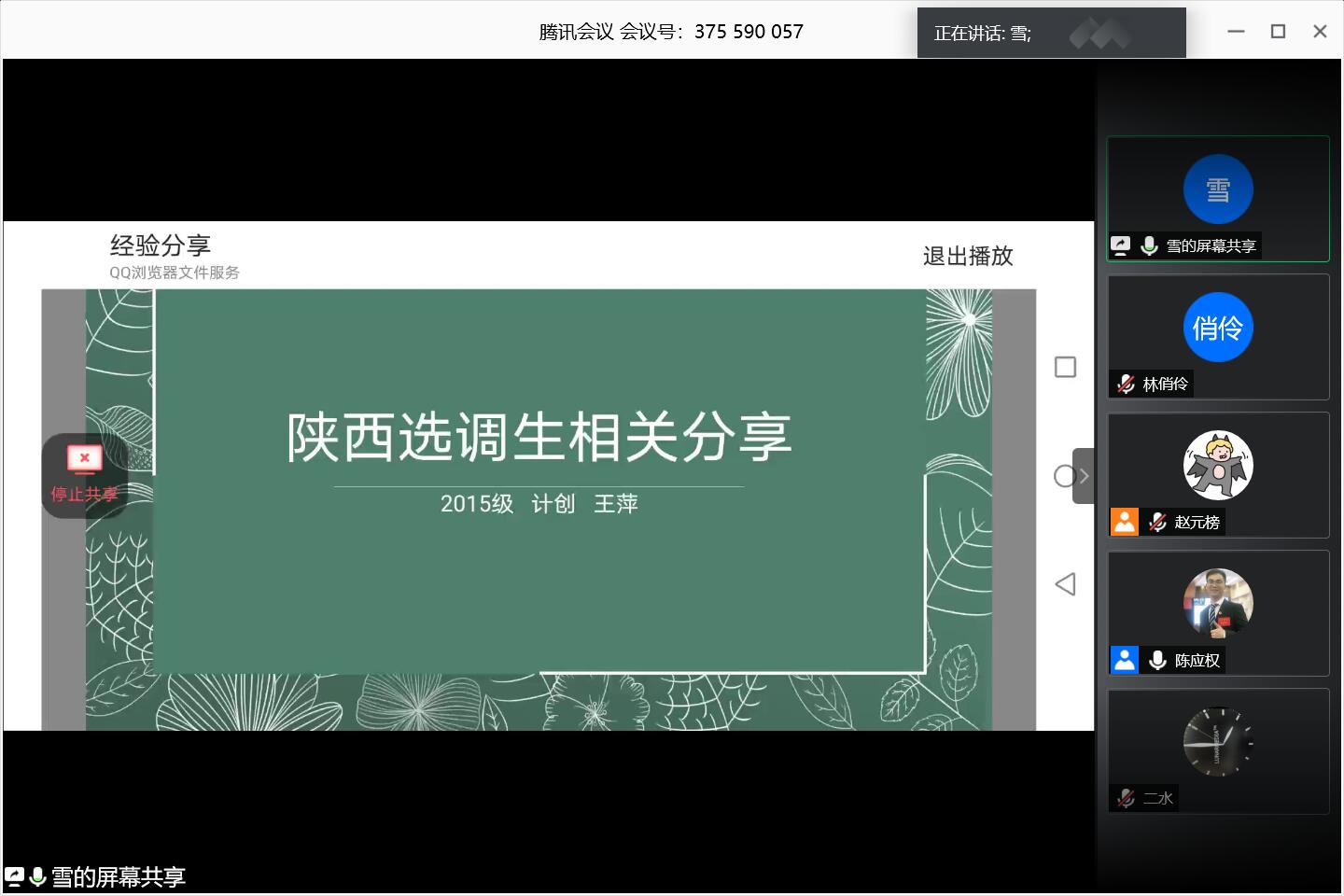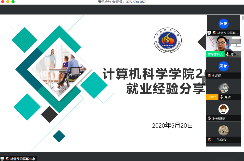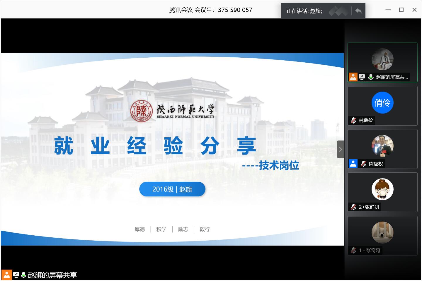 为迎接即将到来的就业季,鼓励同学们积极求职,提高就业率,5月20日晚,必赢官网举办了2021届本科生就业经验线上分享会。本次分享会邀请到15级王萍,16级赵旗、赵元榜等三位学长学姐为2021届本科生分享各自的求职经验,17级的张园园同学向大家分享了自己寻找实习单位的经历。学院党委副书记袁冰、2021届全体本科生参加了本次分享会,分享会由辅导员陈应权主持。