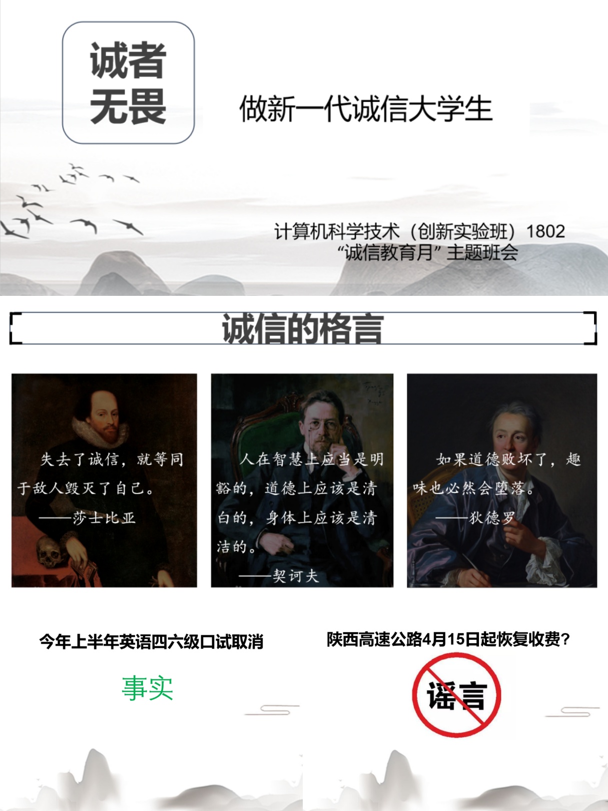 计算机科学与技术1801班以时间为脉络,开展主题为“树诚信风尚,做文明青年”的线上班会。从小时候“借口不写寒假作业”到现在“专门准对大学生的骗局”,整理分享了从小到大我们的亲身经历。通过回忆父母、老师在我们成长过程中的谆谆教诲,让我们坚守诚信。班会的最后,通过展示分享防骗知识,提高同学们的防骗意识。