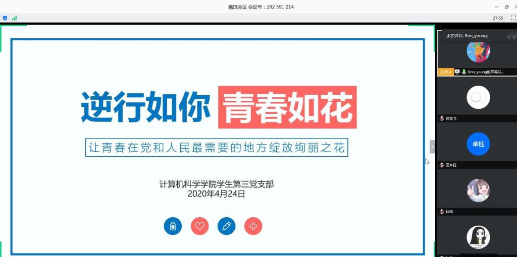 为加强支部建设,凝聚党员思想共识,进一步发挥党组织战斗堡垒作用和党员先锋模范作用,必赢官网学生第三党支部于2020年4月24日通过腾讯会议召开“逆行如你 青春如花”主题党日活动。