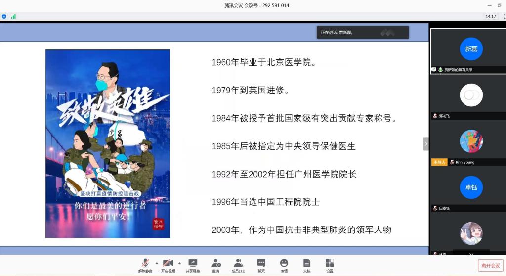 首先,由贾新磊同志带来了“抗疫英雄钟南山、张静静”的五分钟微党课,他从两位抗疫英雄的人生履历谈起,带领大家共同学习了二位的抗疫事迹。他谈到作为青年学生党员,要亮明身份积极发挥引领作用,从自身做起,为抗疫斗争做出积极贡献。