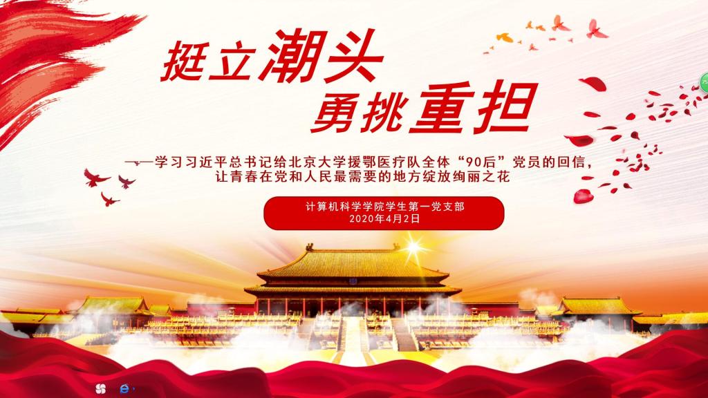 为进一步领会习近平总书记给北京大学援鄂医疗队全体“90后”党员的回信中的重要精神,2020年4月2日晚,必赢官网学生第一党支部开展了“挺立潮头 勇挑重担”主题线上集中学习会议,第二党小组孙乐晴同志主持会议。