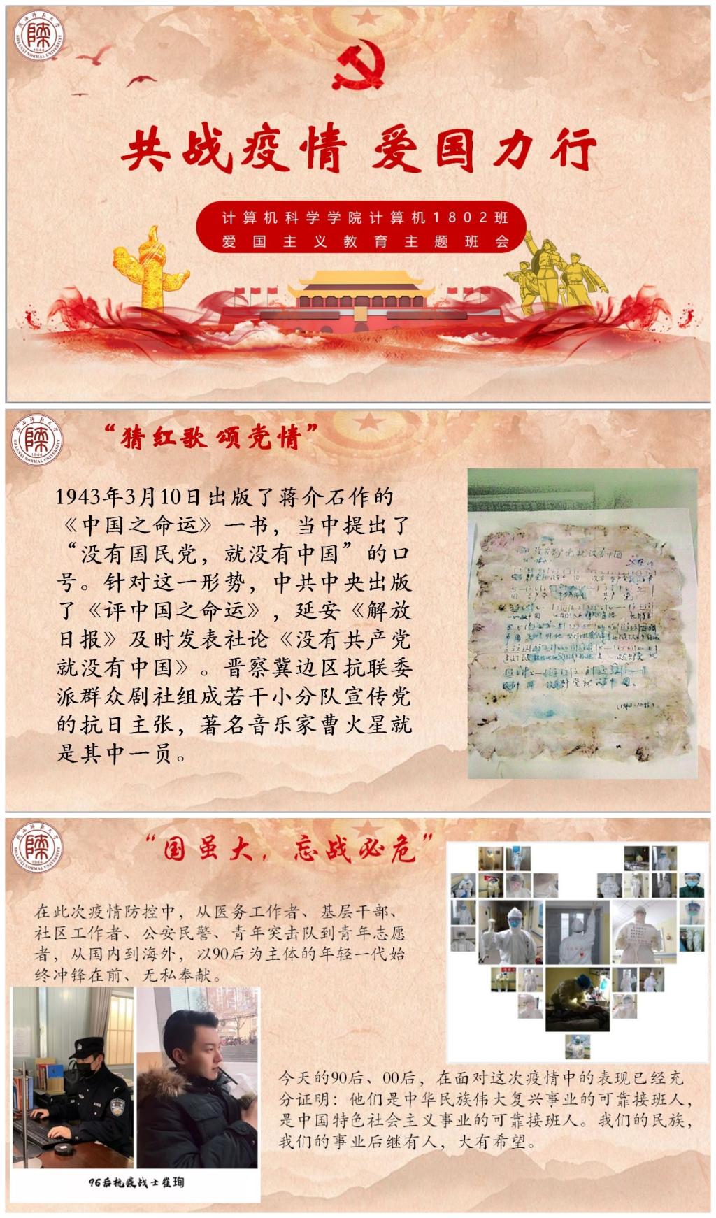 围绕“爱国主义教育”这一主题,各班级将爱国情怀厚植线上班会活动中,采用在线观看视频、红歌接龙、集体学习、诗歌朗诵、心得分享等方式开展了别开生面的线上班会。对同学们而言,主题班会的多元形式极大地提高了参与度,引发同学们对当代青年应该如何来爱国这一问题的深入思考。