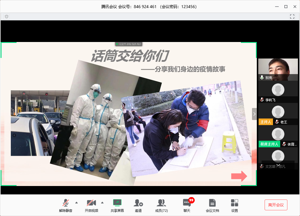 “身边疫情现状”模块中,主持人邀请身在不同地方的同学开麦分享了许多身边的疫情故事。从基层到一线,从青年到中老年,一个个或幽默轻松、或振奋人心、或令人称赞的事例让大家感受到了青年的担当精神和中华儿女磅礴的向心力。