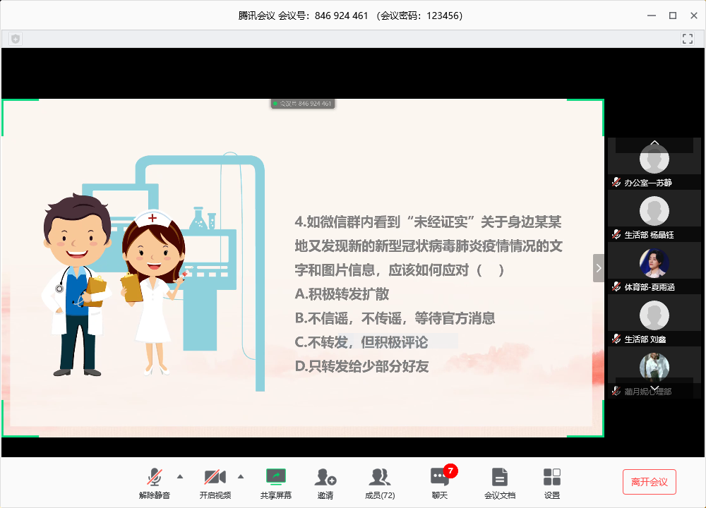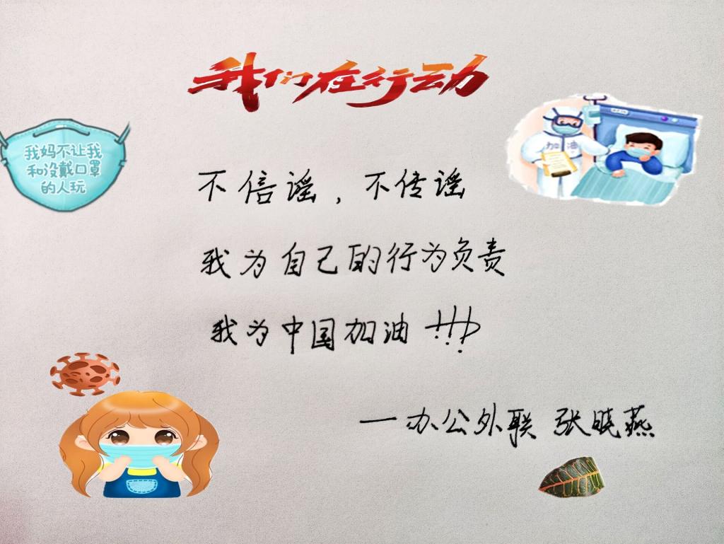 “疫情防控学习”模块中,主持人首先带领同学们一起回顾了习近平总书记在防疫工作部署会上的重要讲话,同时认真学习了共青团中央《关于坚持党的领导,全团动员,在防控疫情阻击战中充分发挥共青团生力军和突击队作用的通知》、教育部给全国大学生的一封信和必赢中国官方网站致陕star的一封信。此外,会议主持人张奥晨向大家展示了一个辟谣专栏,以图片的形式生动地解释谣言为何错误,借此鼓励大家理性思考。通过学习,我们增强了对疫情防控的信心与决心,增长了疫情防控的知识,感受到当代大学生的责任意识、使命意识和担当,我们在战“疫”中得到了成长。