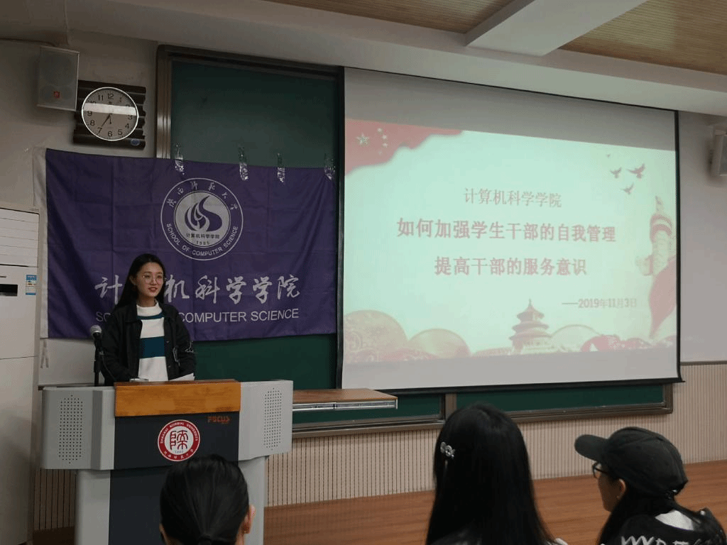培训的最后,王越同学对于在场全体学生干部以及自身提出了期望。她希望学生干部能做到低调做人、高调做事,做有理想、有情怀、有担当的青年能够高效工作,高效学习,充分发挥引领、表率、服务作用,为学院建设和学生发展作出贡献。