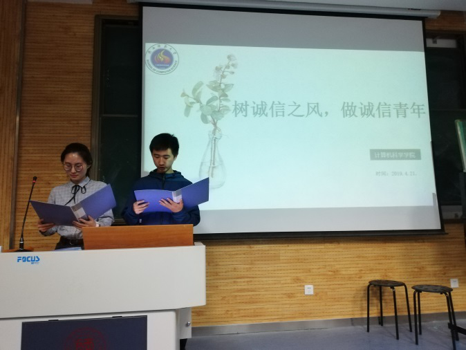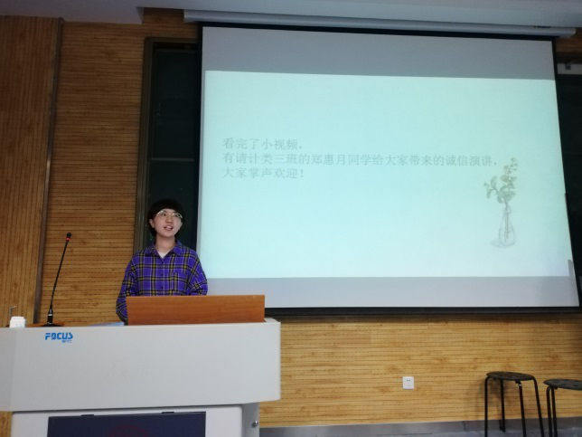 首先,主持人组织同学们观看了“诚信的相遇”小视频,点出本次班会的主题。接着是计类三班郑惠月同学的演讲《人生路漫漫,诚信做伴》,以爱情中的诚信出发,用《招摇》中的故事与《氓》中的男主人公做对比,由小及大,诠释不一样的诚信。