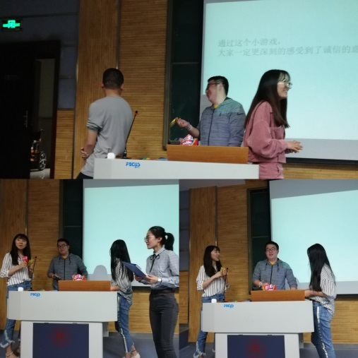 之后,是林殊凡同学主持的游戏环节“信任的进化”,以分糖的形式考验两人的信任,期间,安老师也加入了游戏,与搭档的配合互动让同学们捧腹大笑。接着是诚信知识抢答赛,由主持人读题,其他同学抢答,现场气氛活跃,同学们在抢答中增长了关于诚信的知识,在欢笑中收获颇多。