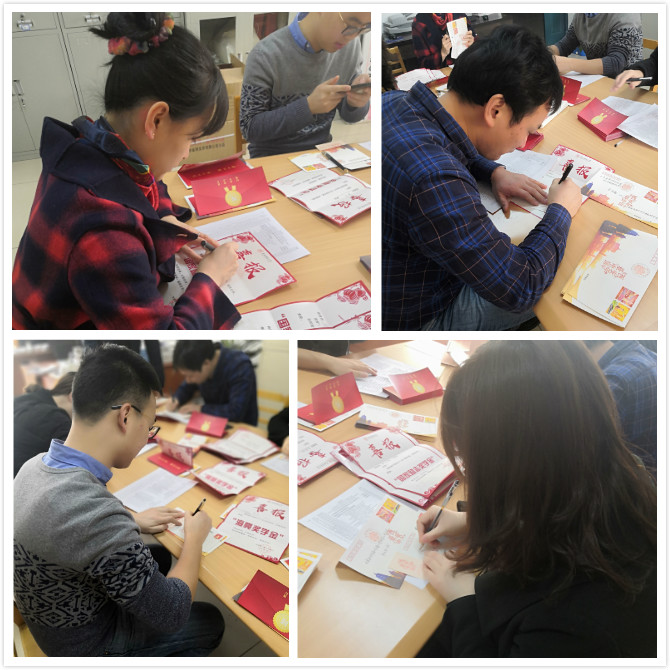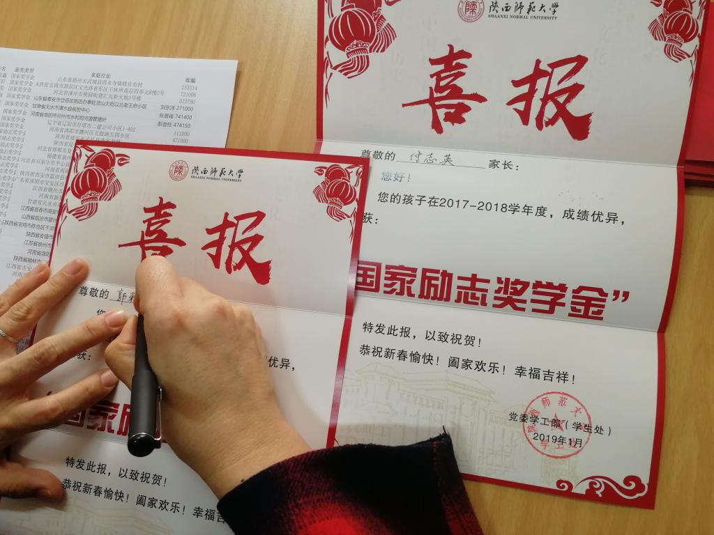 为响应学校号召,表彰优秀学生,增进家长对学生在校情况的了解,共同促进学生成长成才,根据必赢官网2018年度国家奖学金、国家励志奖学金、明德奖学金、叶圣陶奖学金、文源奖学金、感恩中国近现代科学家奖学金、隆基奖学金、海亮奖学金等奖项的获奖名单,学工组袁冰、郭康凌、毛庆、陈应权、卫晓等几位老师亲自为同学们书写喜报。学工组老师们提前通过电话、QQ等方式跟学生取得了联系,确认家庭住址、收件人、邮编等信息,确保了每一封喜报都能准确无误的送达到每一名家长的手中。