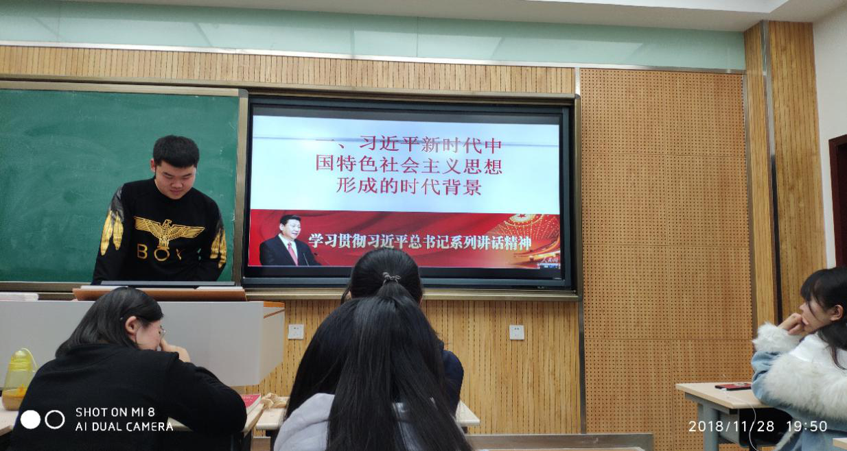 支部副书记陈葳龙习近平新时代中国特色社会主义思想形成的时代背景、习近平新时代中国特色社会主义思想的内容解读和理论贡献为大家进行讲解。使同学们更深刻地认识了习近平新时代中国特色社会主义思想的历史地位和习近平新时代中国特色社会主义思想在理论上的重大突破创新、在实践上的科学指导作用,可以准确把握这一思想的时代背景、精神实质、丰富内涵和实践要求。 最后,杨帅进行了活动总结,并且呼吁鼓舞同学们勿忘初心、一心向党、不断创新、勇争先锋。同学们深受启迪。