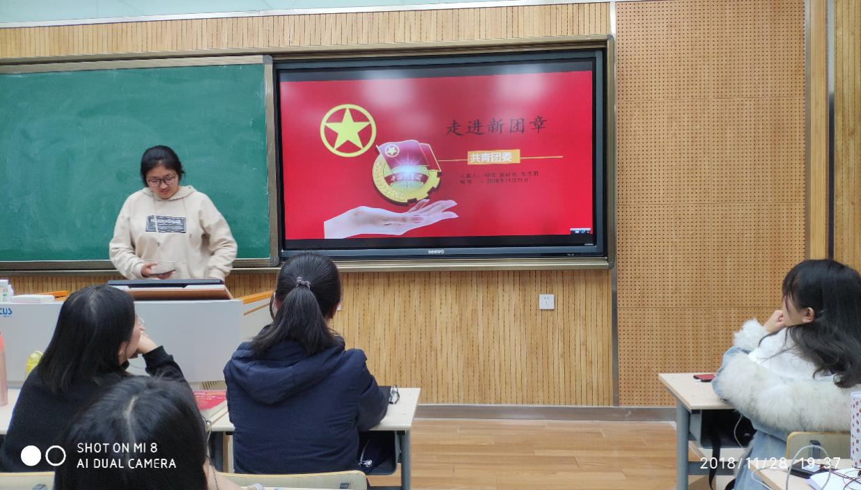 胡佳带领同学们学习了解新团章她从四个部分展开论述:为什么要修改团章、团章修改的特点、团章修改点的学习解读以及团章修正案的重要意义。