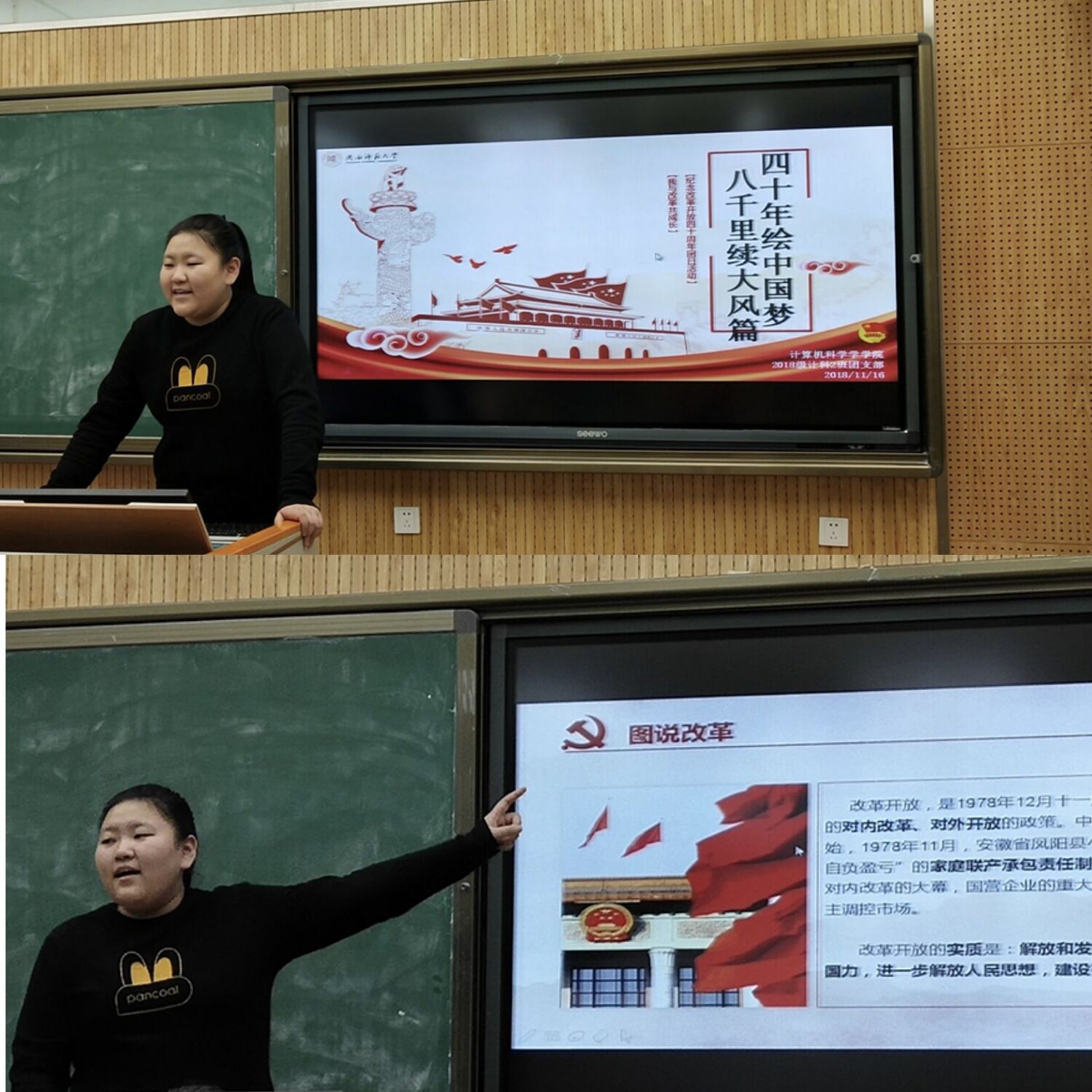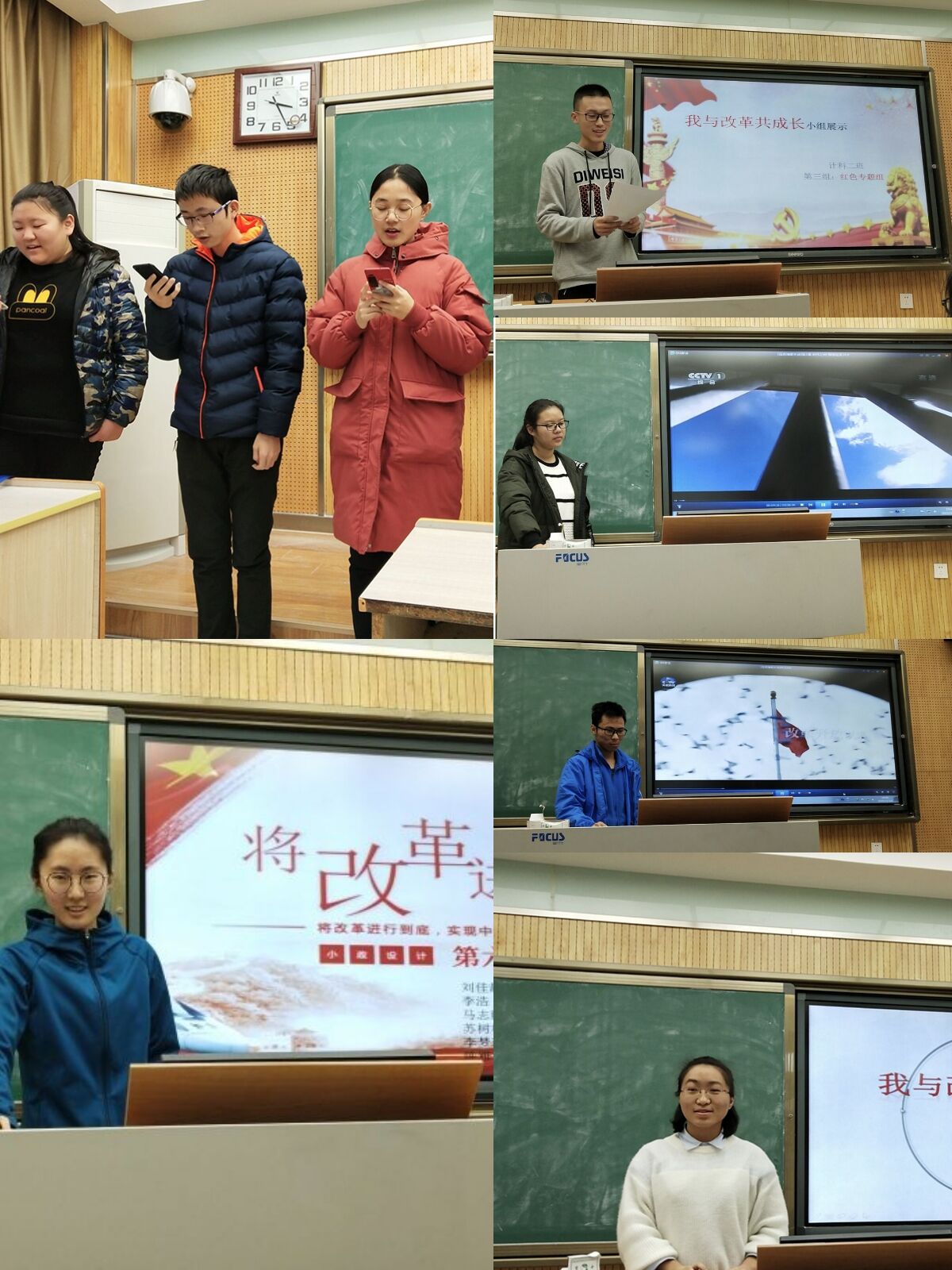 随后,蒋山为同学们播放了《厉害了,我的国!》部分片段,在视频播放过程中,同学们深刻感受到了改革开放四十年来中国发生的巨大变化,并不时发出阵阵感慨,同学们充满了骄傲与自豪。计科二班各个团日活动小组依次上台展示“我与改革共成长”的活动成果,小组们通过唱歌、PPT讲解、播放视频等多种方式充分展示改革开放对我们生活的巨大影响。有同学表示,我们虽然不是改革开放的参与者,我们却是改革开放的受益者。