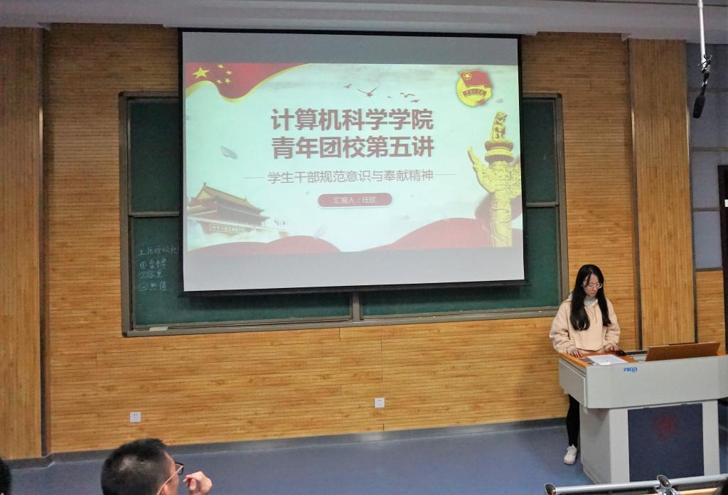 必赢官网青年团校培训班第五讲于11月25日晚在雁塔校区顺利举行。学院学生会副主席、2016级计算机科学与技术(创新实验班)任欣做了题为《学生干部规范意识与奉献精神》的报告,必赢官网2018全体学生干部参加了此次培训。
