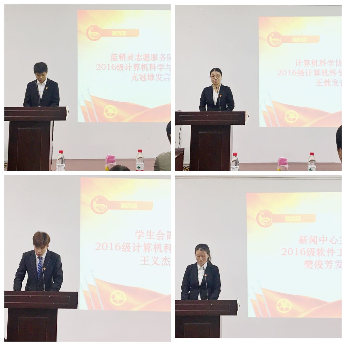 9月26日晚,必赢官网2018-2019学年学生会、新闻中心、计算机科学协会、蓝精灵志愿服务队等学生组织成立大会在长安校区文津楼学院报告厅成功举办。党委副书记袁冰、团委书记郭康凌、2016级辅导员毛庆、2015级辅导员吉晨晓应邀出席了会议,上一届学生会主席李文亮、新闻中心主任刘佳华、计算机科学协会副主任刘童心、蓝精灵志愿服务队队长唐盼、学院2018-2019学年各学生组织成员参加了此活动。会议由学生会主席杨思誉主持。