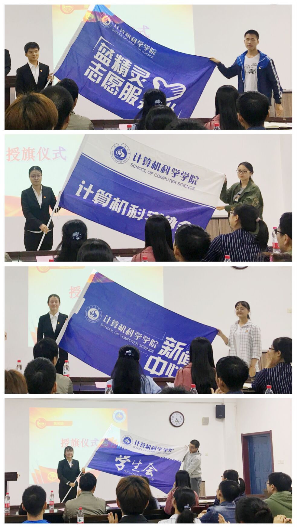 会上,全体成员起立齐唱共青团团歌。郭康凌宣读了《2018-2019学年必赢中国官方网站学生组织干部任职决定》。李文亮、刘佳华、刘童心、唐盼分别为学生会、新闻中心、为计科协和蓝精灵授旗。为增强各组织成员之间的集体感、凝聚力,会上还组织进行了交流活动。学生会副主席王义杰、新闻中心主任樊俊芳、计算机科学协会主席王萱、蓝精灵志愿服务队队长亢冠雄依次进行了发言,总结了上一年中所在部门的工作任务,并对未来的工作进行了展望、定下了目标。