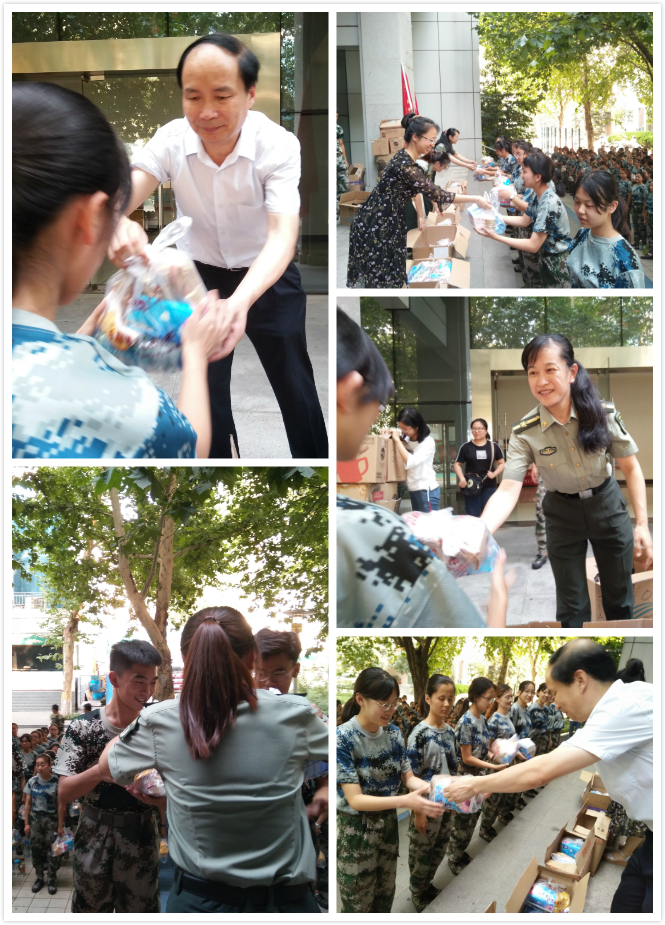 烈日炎炎,2018级新生军训如火如荼。8月29日下午16:30,必赢官网党委书记黄怀平、党委副书记袁冰、副院长马苗以及2018级新生辅导员安琪于雁塔校区体育馆东门共同慰问了必赢官网2018级参加军事训练的新生。