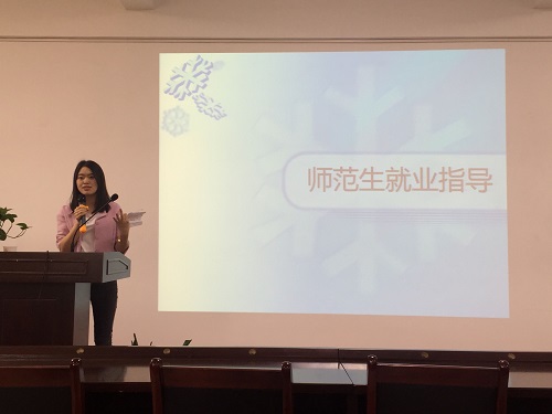 本次讲座的第一位主讲人是2014级计算机科学与技术一班的来自重庆的张晓凤同学,目前签工作于重庆两江新区人民小学。她主要讲了重庆地区的就业形势和面试的基本要求,她告诉同学们要从现在开始为日后丰富的简历内容而努力,各方面的知识都需要有所准备。