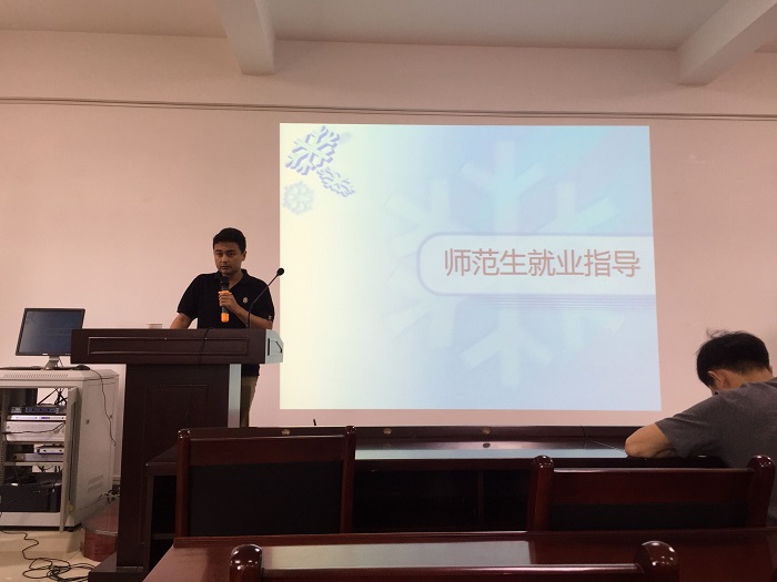 第二位主讲人是2014级计算机科学与技术一班的来自陕西商洛的李孝潮同学,已签工作于长安三中。他讲到面试是一个表现自己的机会,面试时一定要注意自己的谈吐举止,最重要的就是要有自信。他告诉同学们找工作期间要通过各种渠道留意跟自己有关的就业信息,比如师范生群、师大就创网、省教育厅网站等。