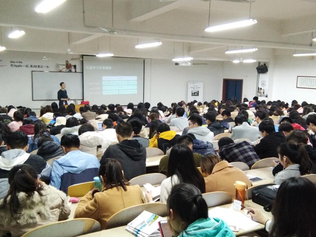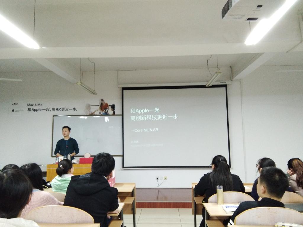 本次讲座以苹果公司春季开学优惠活动Mac 4 me为依托展开,Mac 4 me 春季开学优惠活动使同学们能够零距离感受Apple 最新科技,学习如何将Apple自带软件应用到自己的日常学习与生活中。讲座中,孔文达顾问主要为我们介绍了 CORE ML 和AR 两项技术。Core ML 是 Apple 今年 WWDC 新推出面向开发者的机器学习框架。Core ML 让我们将很多机器学习模型集成到app中。我们可以在移动设备上运行机器学习模型,数据可以不离开设备直接被分析。AR即增强现实,也被称之为混合现实。它通过电脑技术,将虚拟的信息应用到真实世界,真实的环境和虚拟的物体实时地叠加到了同一个画面或空间同时存在。同学们认真听取孔文达顾问的讲解,孔文达顾问也用自己的手机向我们展示了苹果手机目前对这两项技术的应用,同学们在观看展示的过程中,更近一步了解到机器正逐步取代人的工作,体会到了科学的魅力。讲座最后,孔文达顾问为我们播放了由陈可辛导演用苹果手机拍出的记录短片—“三分钟”。