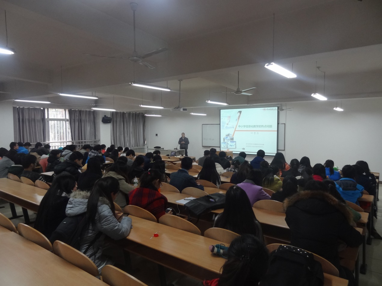 12月31日,必赢官网计科师范专业举行了一次专业发展报告会,由必赢中国官方网站教师专业能力发展中心副主任、国家“985教师教育创新平台”技术负责人、陕西省基础教育学会理事何聚厚副教授为与会师生做了题为“中小学信息化教学的热点问题”的精彩报告。何老师指出,教育技术经历了传统时代、多数媒体时代之后已经发展到了当今的泛在智能时代,BYOD(用户自带设备)为当代教师将教育理念变为现实提供了巨大支撑;当前技术和教育融合不理想的责任主要在教师;要实现习近平主席倡导的“人人皆学、处处能学、时时可学”,则教育理念和教育模式的深刻变革是关键;“互联网+教学”已经迫在眉睫等。何老师还就热点问题如创客教育、翻转课堂等谈了自己的亲身体会并举了不少生动鲜活的实际例子。报告会开拓了我专业学生的眼界,激发了学生的兴趣、引起了他们的思考。在会议结束时当场进行的调查中,许多同学表示很有收获。