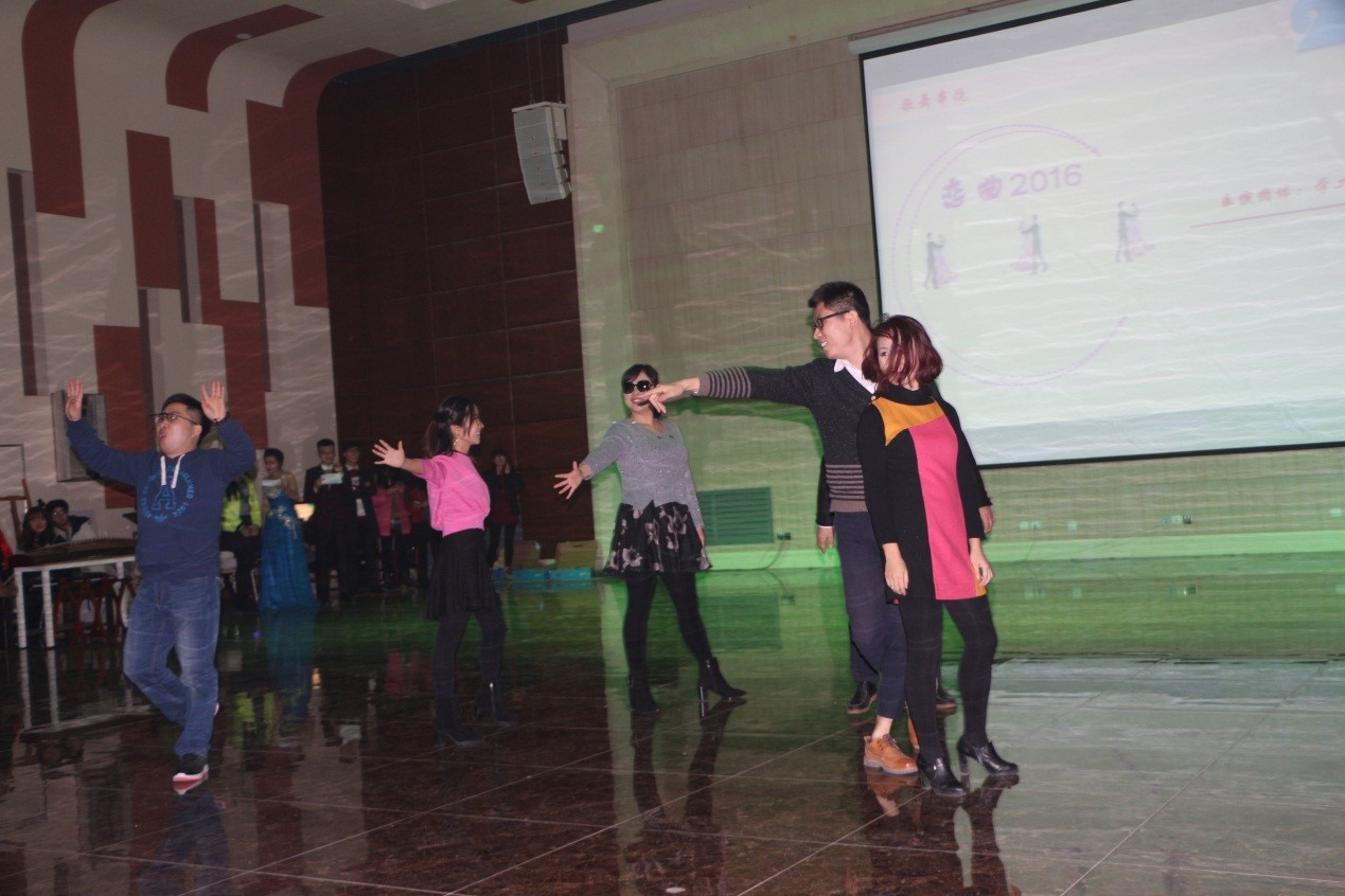 舞会由The one街舞社带来的精彩街舞拉开序幕。随后学院院长王小明教授进行新年致辞,他对学院在2015年的工作进行了总结并表达了对2016年的希冀。伴随着华尔兹舞曲响起同学们纷纷邀请老师在舞池中央翩翩起舞,观众的热情与晚会现场的气氛逐渐升温;在紧张激烈的听音乐猜歌名游戏环节,同学们踊跃参与,现场气氛热烈到了极点;学院教师们的时装秀让大家眼前一亮,平时严肃干练的老师俨然成为时尚达人;时装秀后由学院领导及老师们抽取幸运观众,被抽中的同学都得到了老师们精心准备的礼物,“苹果牌笔记本”更是让同学们惊叫连连;肆沐乐队动感青春的歌曲《出发》寓意着2016年的新路程即将开始;一中国传统文化节目串烧,把中国文化的博大精深展现的淋漓尽致;爵士舞用绝妙的舞姿将现场气氛推向了高潮;在舞会进行过程中,同学们还通过微信墙积极发送话题表达了对舞会的期待和祝福。
