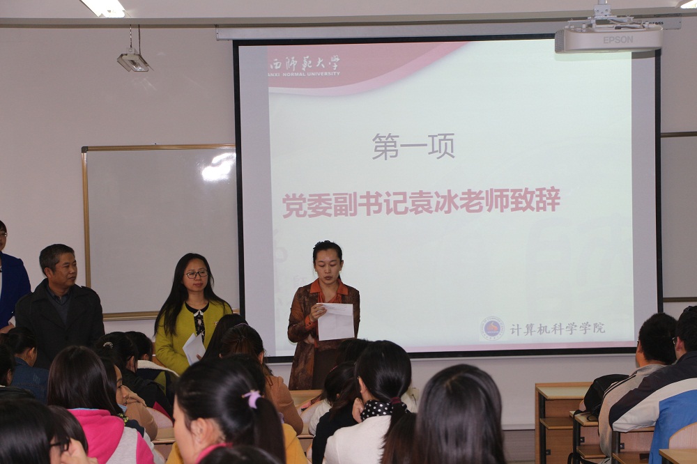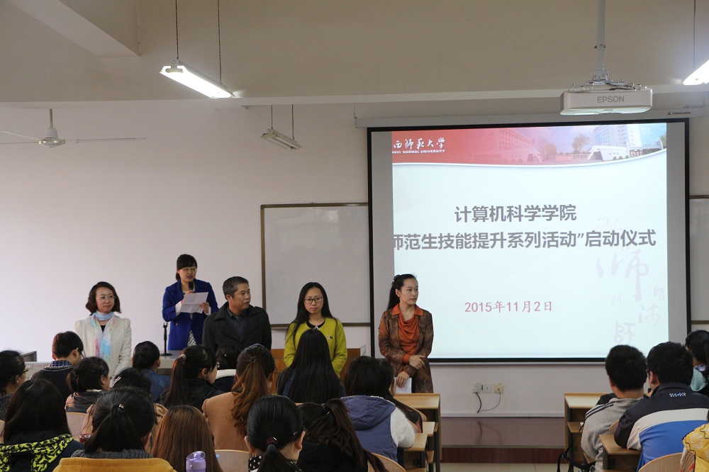 11月2日下午16:30,必赢官网“师范生技能提升系列活动”启动仪式在文津楼219教室举行。学院党委副书记袁冰、副院长马苗、团委书记胡雯洁、教学秘书朱炜、2012级辅导员张冲、2013级辅导员冯倩出席了启动仪式。2013级、2014级计算机科学与技术专业全体免费师范生参加了本次活动。启动仪式由2014级辅导员郭康凌主持。
