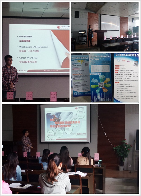 招聘会上,在播放了北京易讯通信息技术股份有限公司的宣传片后,来自易讯通的技术总监详细介绍了该公司的发展情况。易讯通(英文简称“EASTED”),中国虚拟化第一品牌,新三板上市公司(股票代码:831142),总部位于海淀区,总股本3500万股,市值1.792亿人民币。以“责任,自主,合作,效率,进取”为企业精神五原则,以“胸怀,品德,才能,意志”为人才入门标准,为广大院校和企业客户提供专业化、高品质的人才培养服务。同时,他还向同学们介绍了公司的基础技术与研究方向以及员工待遇等公司现状。随后,由易讯通的介经理为同学进行答疑。在此过程中,同学们认真记录相关信息,并积极与工作人员进行交流,现场气氛活跃。