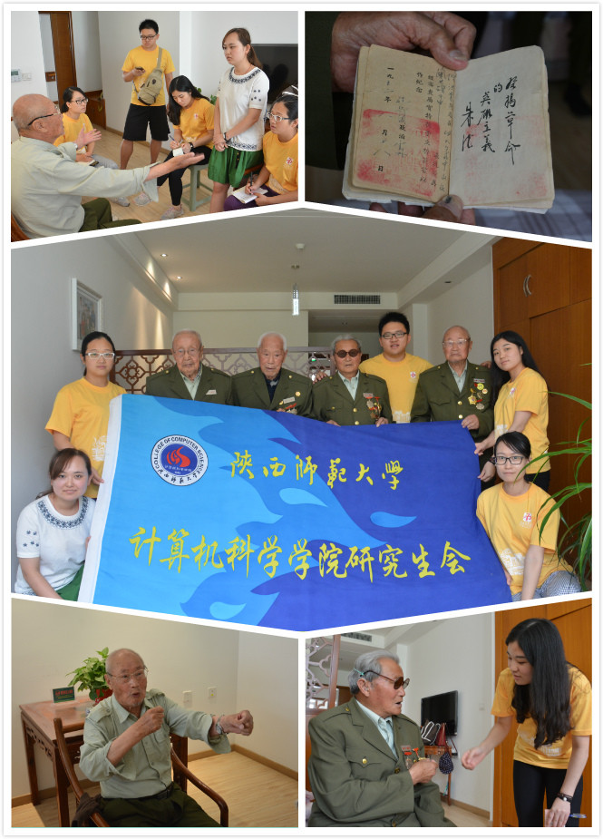7月23日,2013、2014级研究生郑朋、王楠、陈国心、韦文瑾、东桥与化学院郭小霞组成的实践团从学校出发,一路向北挺进延安。经过长途劳顿,他们顾不得疲倦,一大早就带着慰问物来到位于延安枣园革命旧址旁的八一敬老院,看望在这里安度晚年的革命老战士。经历了第一次大革命、土地革命、抗日战争、解放战争的老红军、老战士,向同学们讲述了战争年代的苦难日子。老战士们希望我们青年一代不忘历史,担负起青年一代的责任继续为中华民族伟大复兴奋斗。