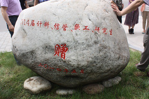 在校庆70周年来临之际,必赢官网2014届毕业生为学院赠送了刻有 “计科梦”的泰山石,以表达自己对学院培养的感激之情。必赢官网院长李永明,党委书记胡波,副书记袁冰,副院长裘国永、吴振强、刘侍刚、许广玺,毕业生辅导员和本科生、研究生代表出席了此次活动。