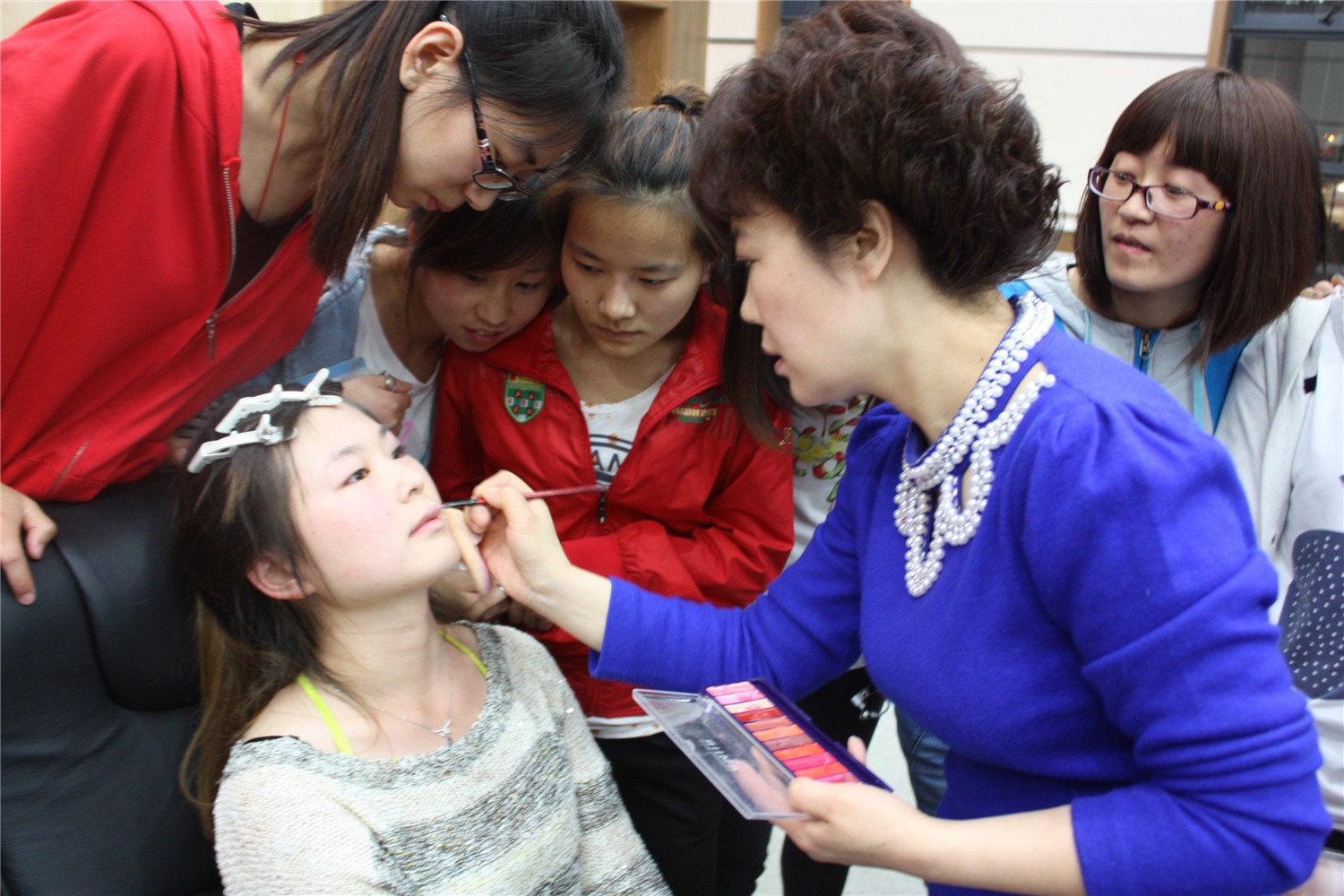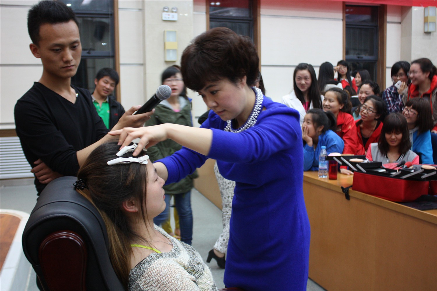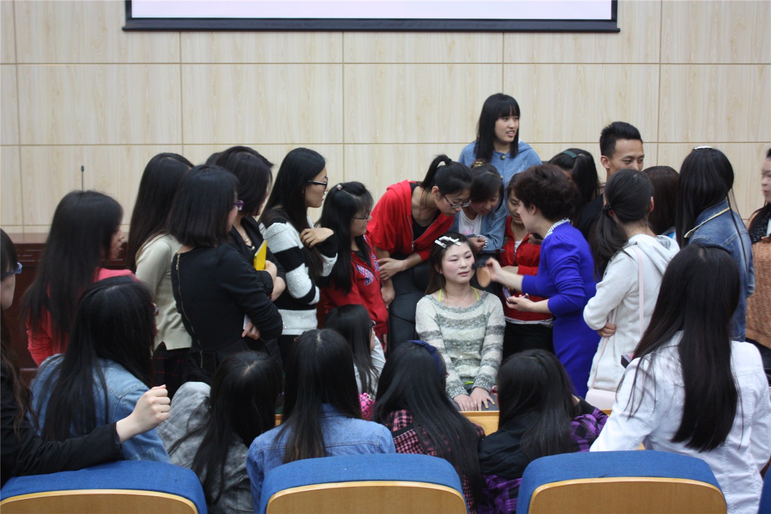 吴老师首先为大家讲解了什么是形象以及形象关乎的价值。她解释了形象包含发型、五官、妆面、色彩、体型、材质、搭配、风格定位等诸多的元素,在一个完美的形象中要求每个元素都要发挥到最佳状态。然后,吴老师用实例指出了同学们平时“服装色彩搭配”中存在的一些误区,并逐一加以剖析和纠正,同时提出了许多好的建议。之后吴老师还向大家列举了优雅型、自然型、前卫少女型等八大风格特征,并现场请同学上台做了详细的说明,教大家如何给自己的风格定位。最后,吴老师着重介绍了塑造完美妆容的有效方法,她特地请一名女生上台,现场为大家演示了如何化生活妆。整场讲座中,吴老师和同学们互动不断,极大的活跃了现场气氛。预定一个半小时的讲座一直持续了三个小时,同学们仍意犹未尽。