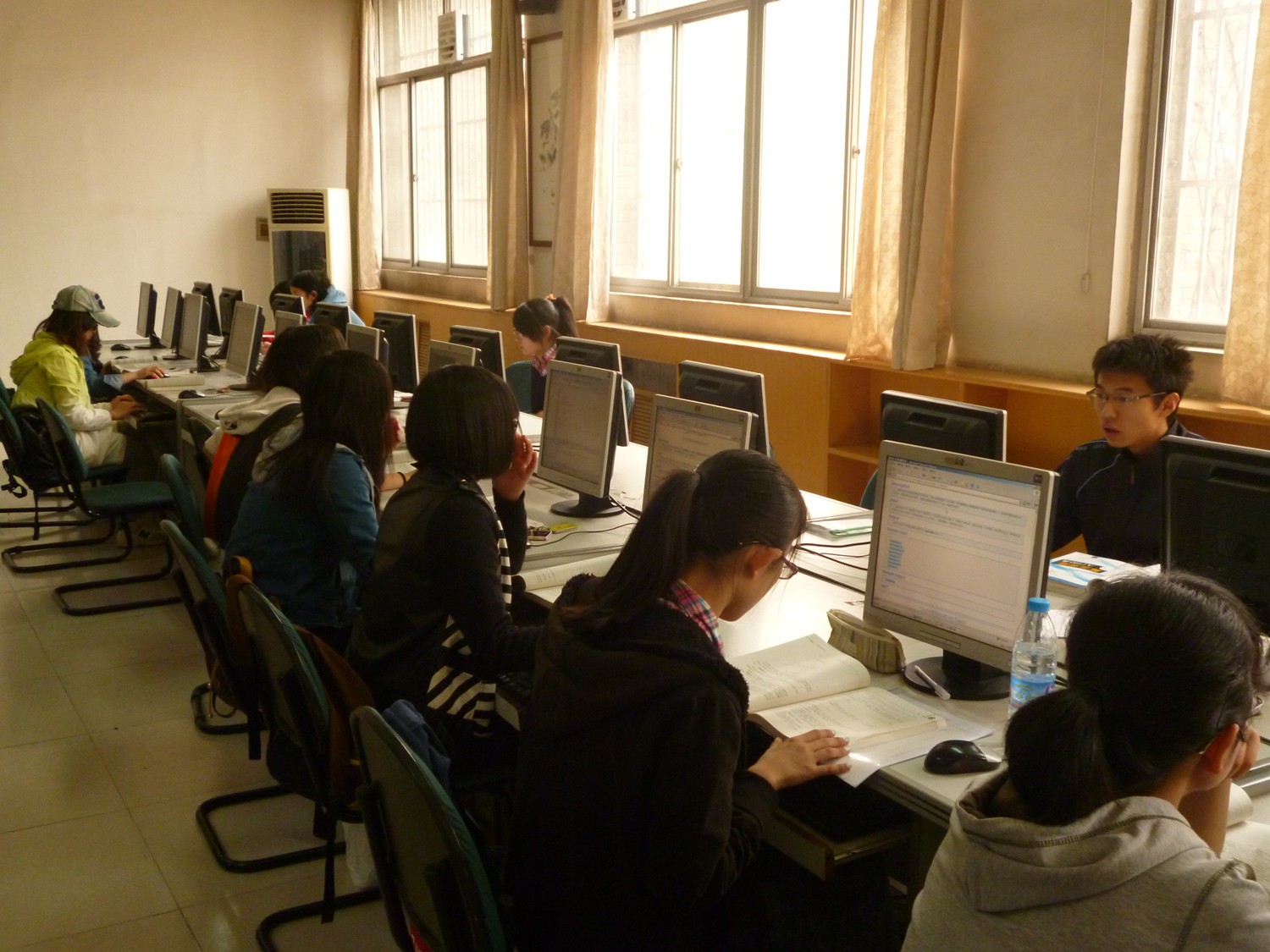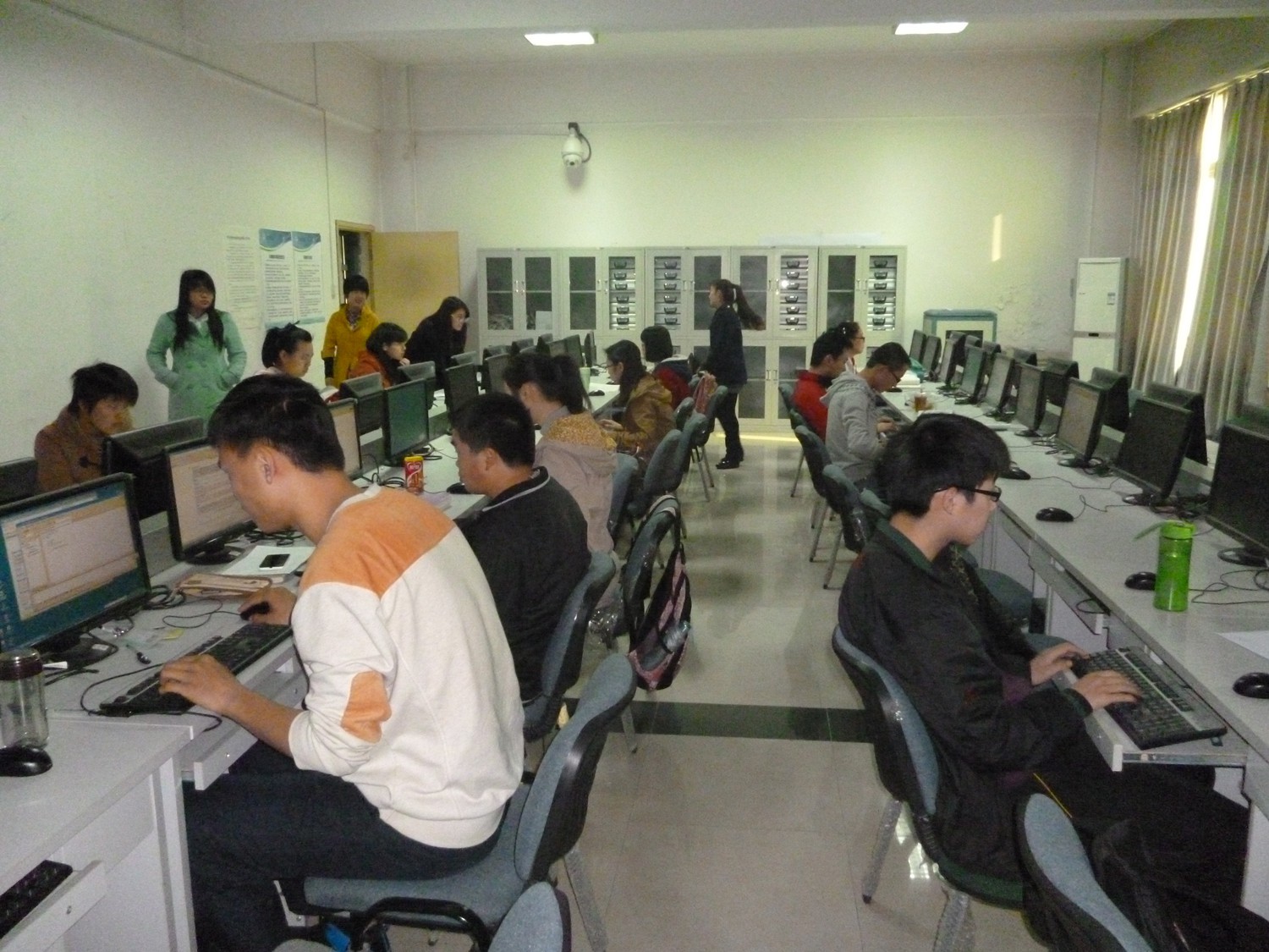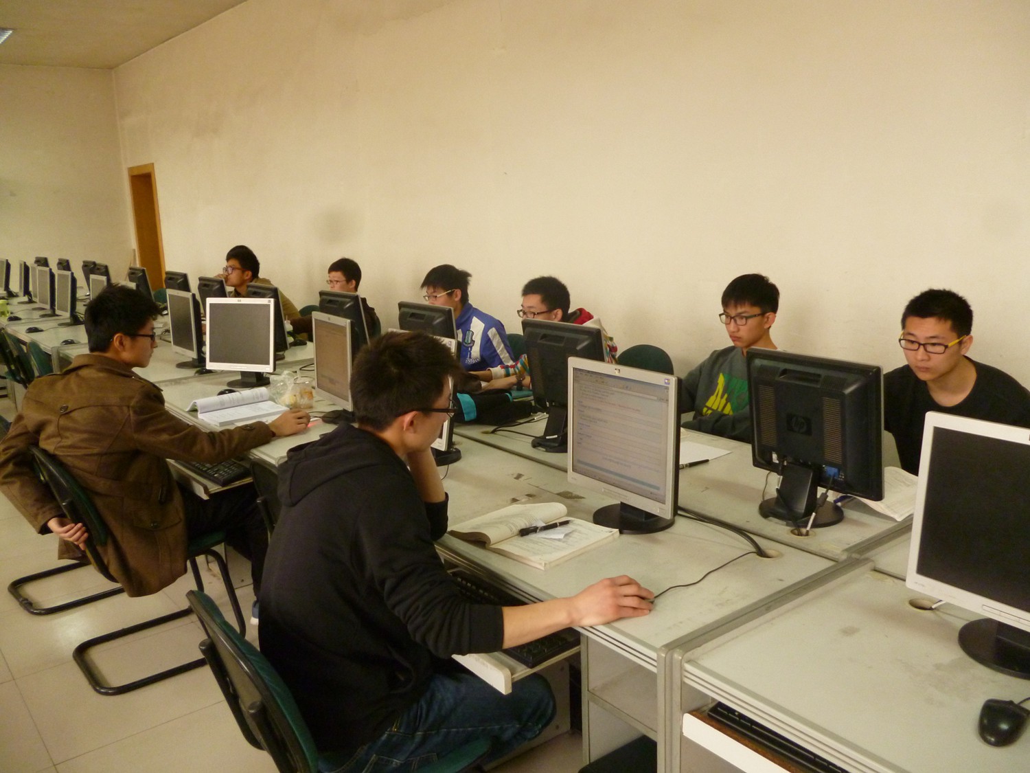 本次“快码加编”程序设计竞赛时长为2个小时30分钟。竞赛分为两个考场,长安校区的逸夫科技信息楼计算机实验室,以及雁塔校区教学三楼计算机实验室。每位参赛同学签到入场,提前进入考场熟悉测评环境。同学们的参与热情很高,聚精会神的编写程序。期间,集训队的前任队员们也来现场指导,关注竞赛情况。