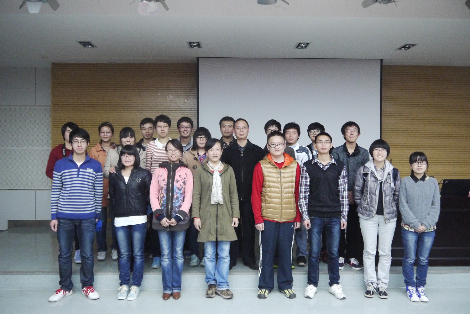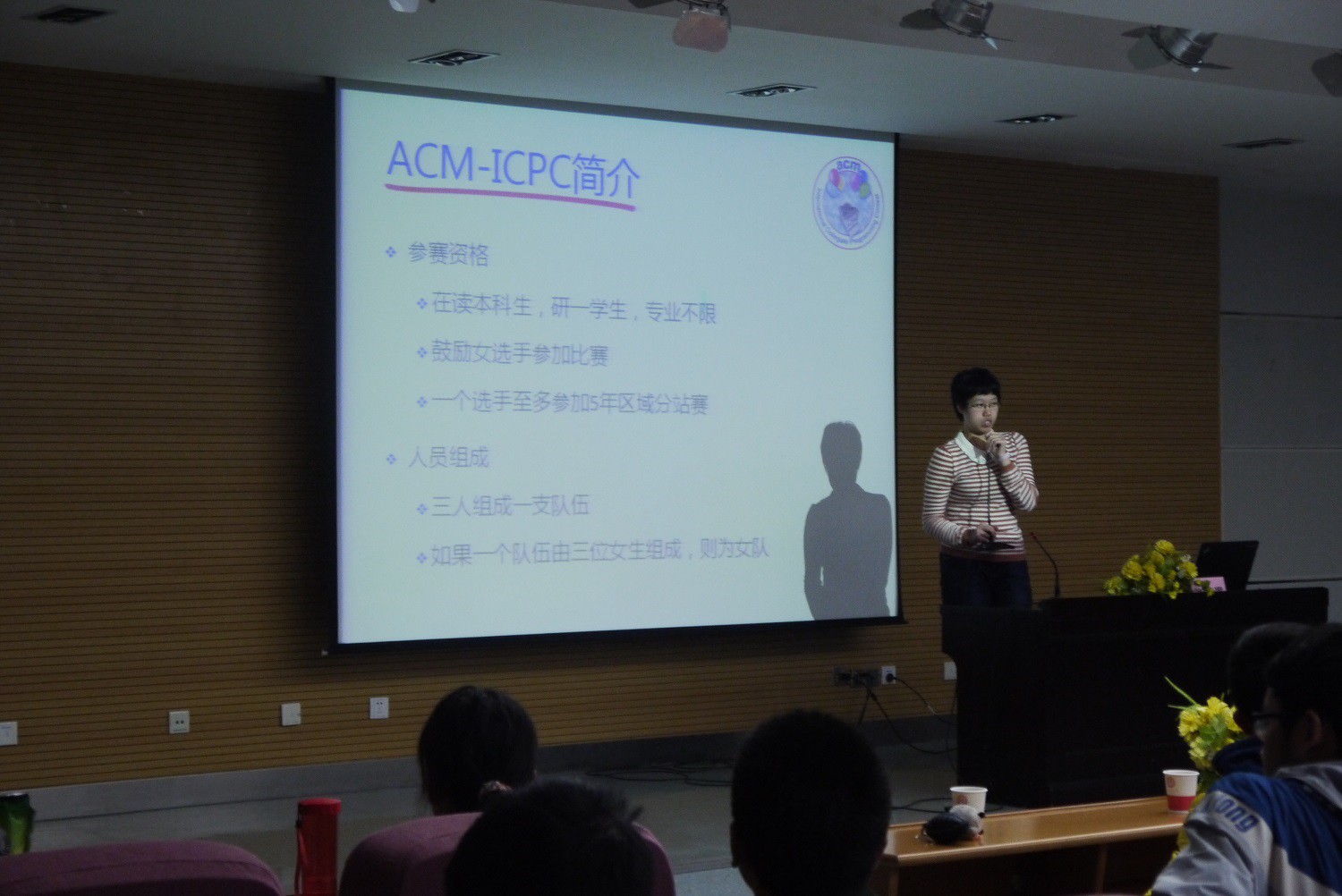 11月8日晚,ACM-ICPC竞赛雁塔校区宣讲会在崇鋈楼三层归仁堂举行,必赢中国官方网站副院长吴振强教授、党委副书记袁冰老师、团委书记胡雯洁老师和理工科基础教学部辅导员杨涛老师出席了宣讲会。首先,我校ACM竞赛团队成员张瑞文向在座2013级同学介绍了ACM-ICPC(即国际大学生程序设计大赛)的竞赛规则、赛制、我校ACM队伍的发展等内容,向同学们展现了一个严谨、严格,却又趣味无穷的世界,使在场同学了解到,这个号称“头脑风暴”的国际性比赛,既考验队员们的编程能力、数理逻辑思维能力,也同样考验着队员们的英语阅读能力和团队精神。我校ACM集训队由王涛老师指导,今年首次参加国内各项比赛就取得了多项优异的成绩,博得了在场同学们的阵阵掌声。