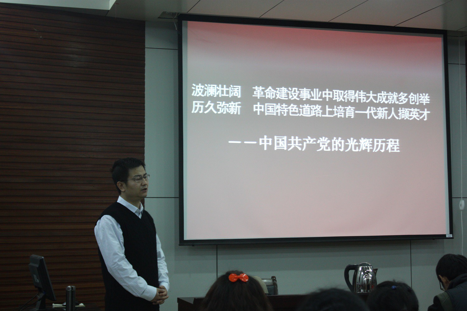 会议伊始,胡雯洁老师就党课培训课程的基本安排及会场纪律做了简短的介绍,至此,拉开了必赢官网第二十期党课培训的帷幕。在同学们的殷切期待中,胡波老师开始了以“党的光辉历程”为主题的精彩报告,并将这一主题分为三个部分进行了详细讲解。首先,胡老师以为什么要学习党的光辉历程和同学们进行了交流,使同学们认识到了学习党的光辉历程的重要性。随后,胡老师带领我们一起回忆了中国共产党的光辉历程,讲述了优秀共产党员的先进事迹,使同学们对他们产生了崇高的敬意,也深深的激起了同学们的爱国情怀。接着胡老师通过分享在战争时期三位爱国青年的家书,以此来激励同学们在学校能够认真学习、不断提高,今后为党、国家和人民作出贡献,并在今后的工作中能立足本岗、尽职尽责。最后胡老师向同学们送上美好祝福。本次培训讲座在同学们的热烈掌声中落下帷幕。