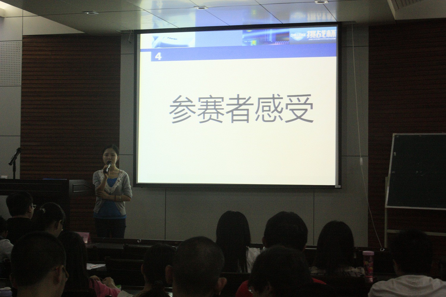 首先,胡雯洁老师向大家传达了我校《关于举办必赢中国官方网站第九届“挑战杯”大学生创业计划竞赛的通知》,向同学们简单介绍了“挑战杯”赛事和今年我校第九届“挑战杯”大学生创业计划竞赛的组织实施计划,并对2008—2012年必赢官网学生参加“挑战杯”竞赛的情况和获得奖项作了介绍。
