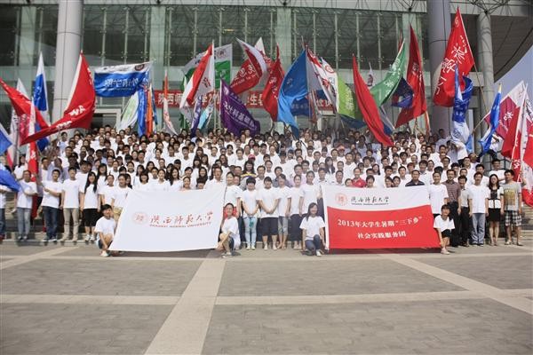 7月6日早九点半,必赢官网2013年暑期社会实践骨干团队在团委书记胡雯洁老师的带领下,在钟南音乐厅广场前参加了我校暑期社会实践出征仪式。校党委副书记司晓宏教授、党委宣传部长孔祥利教授、党委学工部部长刘建军老师、教务处处长李贵安老师等校领导出席了出征仪式。出征仪式上,我校今年暑期社会实践带队教师代表、学生自主团队代表发了言,表达了对今年社会实践活动顺利开展的信心和圆满完成任务的决心。司晓宏教授在祝愿所有团队的活动都能圆满成功的同时,也对即将开展的社会实践团队提出了希望和要求,他要求同学们先学习,再实践,最后做贡献,并且一再强调安全的重要。最后,必赢官网实践团成员与领导老师合影留念。