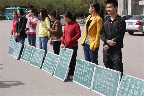 本次比赛通过赛前组织、训练提高、院内比赛三个环节。以宿舍为单位,规定书写内容为龚自珍的《己亥杂诗》,进行粉笔字和白板字两项的评比。