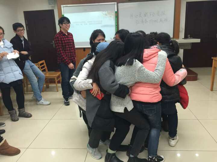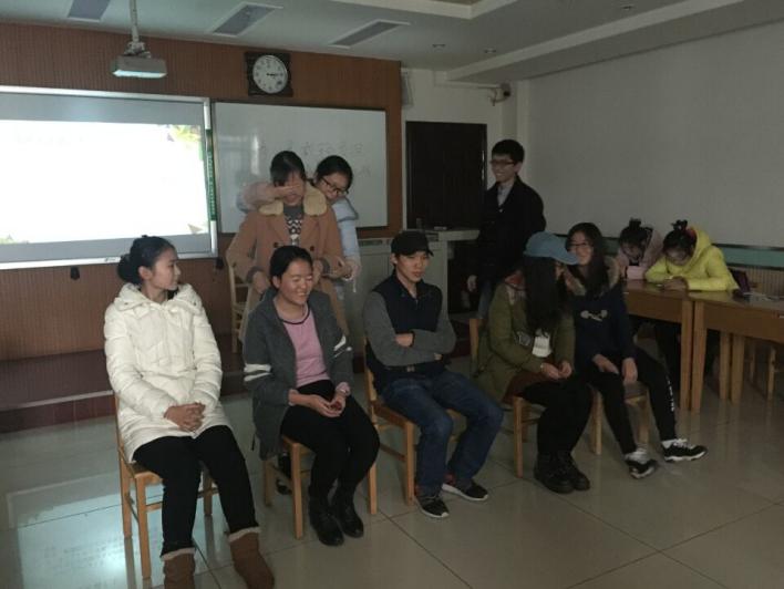 最后一项内容是让全班同学分成两组,前面的人坐后面人的腿上,围成一圈,看哪一组的同学坚持的时间长。这个游戏考验了团队的默契,让大家意识到团队协作的重要性,游戏之前大家都觉得非常简单,但游戏进行时大家才发现它没有想象中那么容易,尤其是大家互相加油打气的场景让我非常感动。