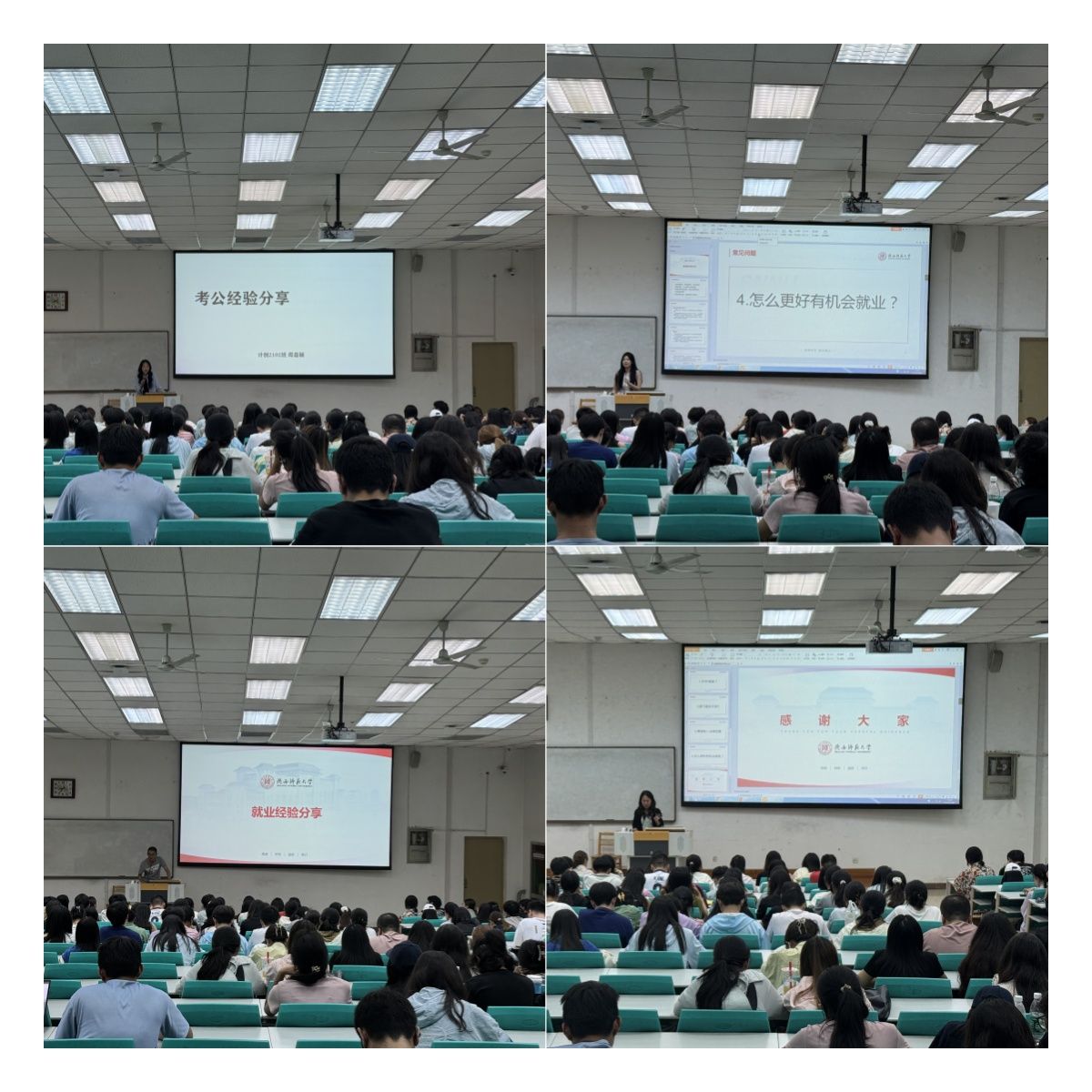 李熙媛围绕自我定位、多手准备、备考计划分享了报考军队文职经验,周嘉颖从备考时间、学习方法、答题技巧方面分享了考公心得,窦思玉、李鑫煜、李文慧、吴树菁分别从就业选择、提早筹划、全面准备、面试注意事项等方面详细分享了报考企业的经验,同时对同学们目前的状态及就业形势进行了分析和建议。
