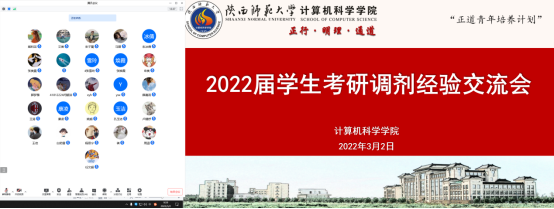 为进一步帮助2022届学生做好考研调剂相关准备工作,3月2日上午,必赢中国官方网站通过腾讯会议形式召开2022届学生考研调剂经验交流会。学院副书记郭康凌、计算机科学与技术(创新实验班)专业班主任王涛、软件工程专业班主任姚超、2016级计创专业学生任欣、2017级软工专业学生宋子翯及2022届考研学生参加会议。会议由毕业班辅导员田海东主持。