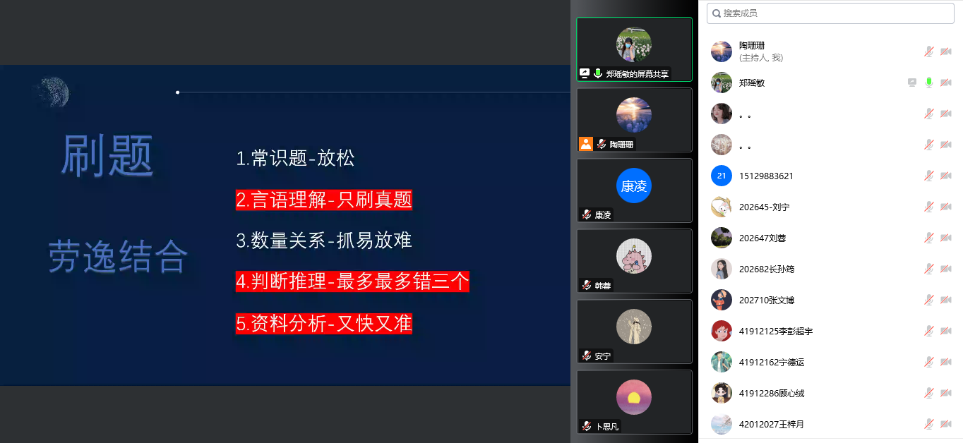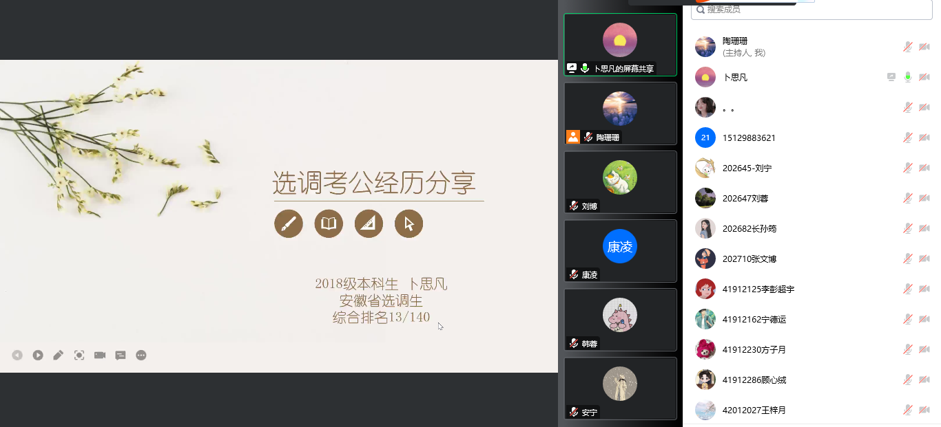 在互动环节,同学们积极参与,提出自己的问题,学长学姐们详细为他们答疑解惑。袁珂月总结了此次交流会,希望大家能抓紧时间积极备考,刘柱祝愿大家未来都能成功上岸。