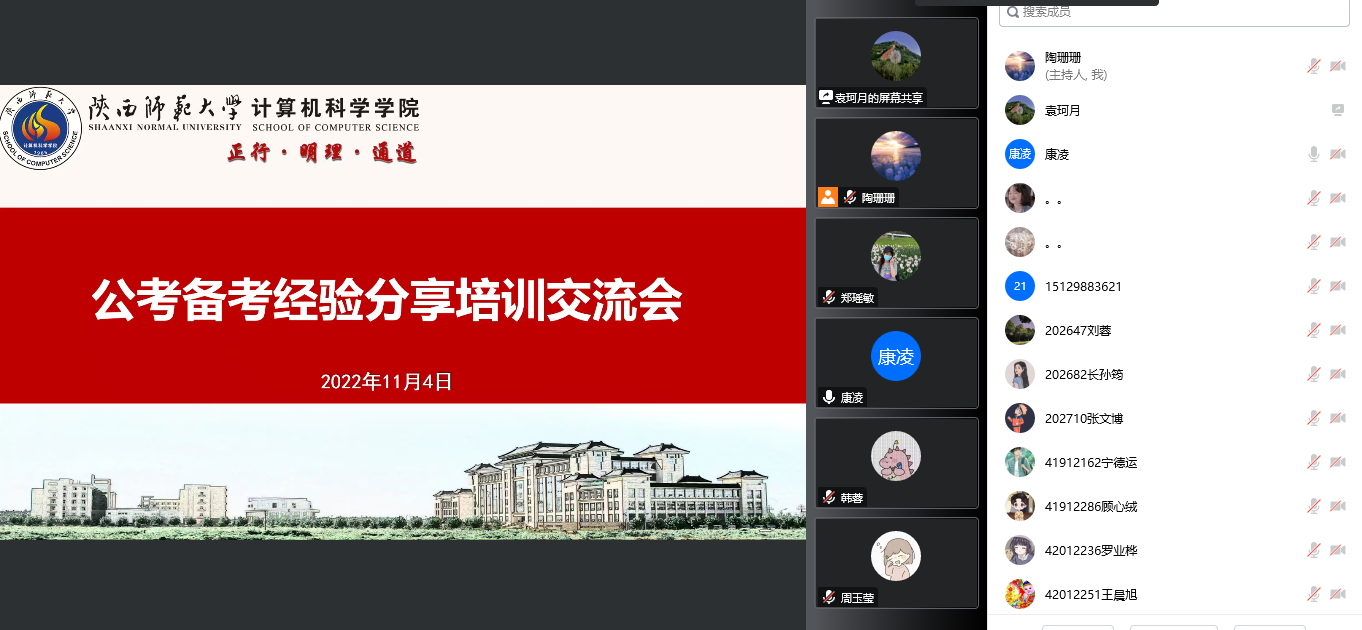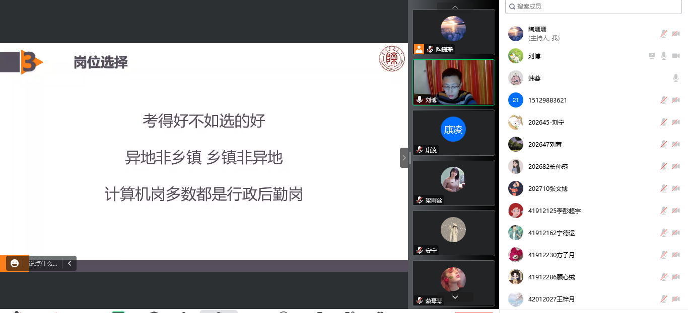 为帮助2023届毕业生充分了解公务员、选调生考试的形式与内容,掌握笔、面试技巧,助力学生顺利上岸,必赢官网于2022年11月4日晚通过腾讯会议举办线上备考经验分享培训交流会。交流会邀请了5位成功上岸公务员、选调生以及事业单位的优秀校友分享备考经验。分享会由学院党委副书记郭康凌主持,研究生辅导员袁珂月、本科生辅导员刘柱、研究生兼职辅导员陶珊珊,以及2023届意向公考的本科生、研究生同学参加会议。
