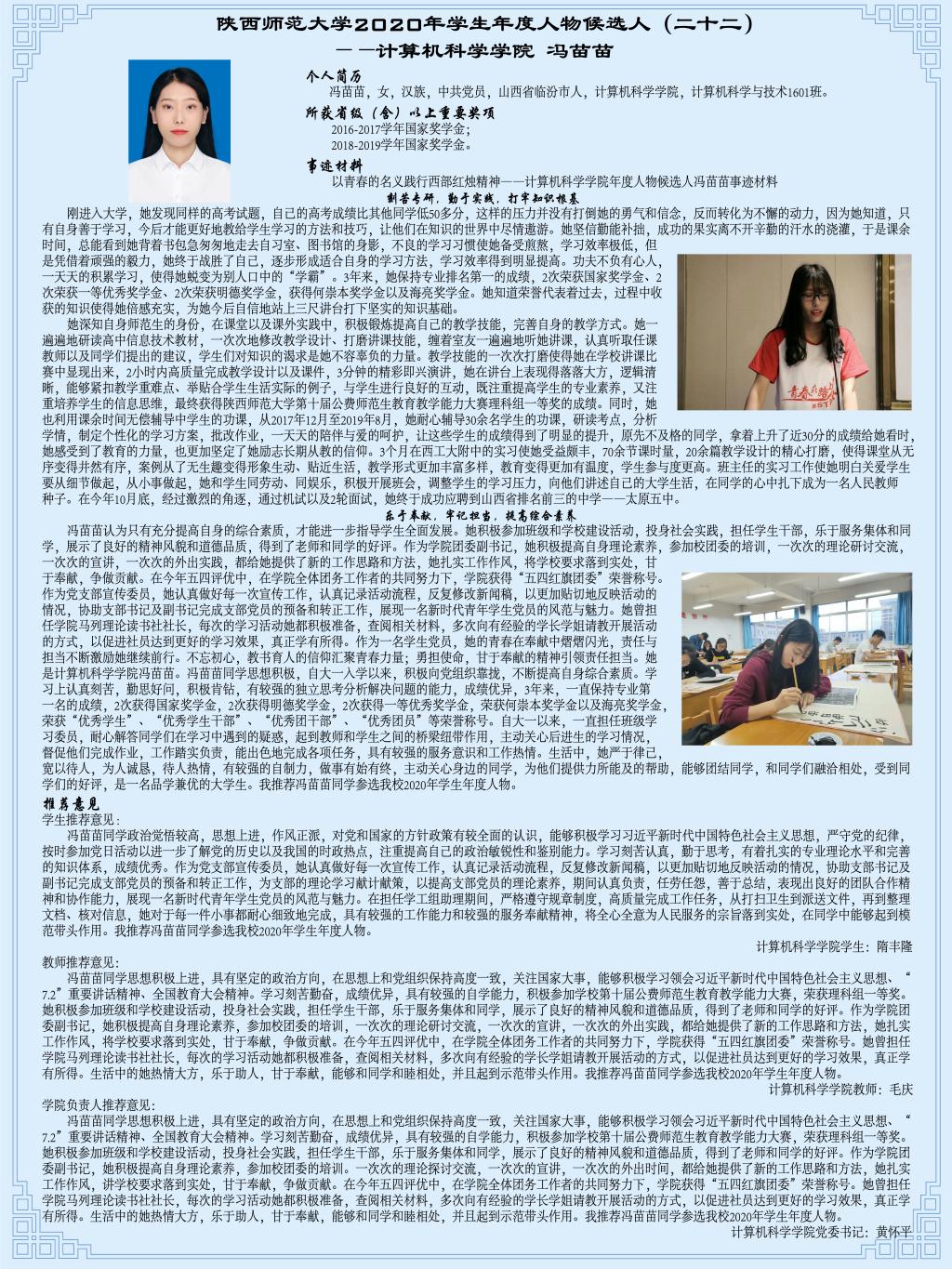 青春逢盛世,奋斗正当时——必赢中国官方网站2020年学生年度人物候选人必赢官网2016级本科生冯苗苗