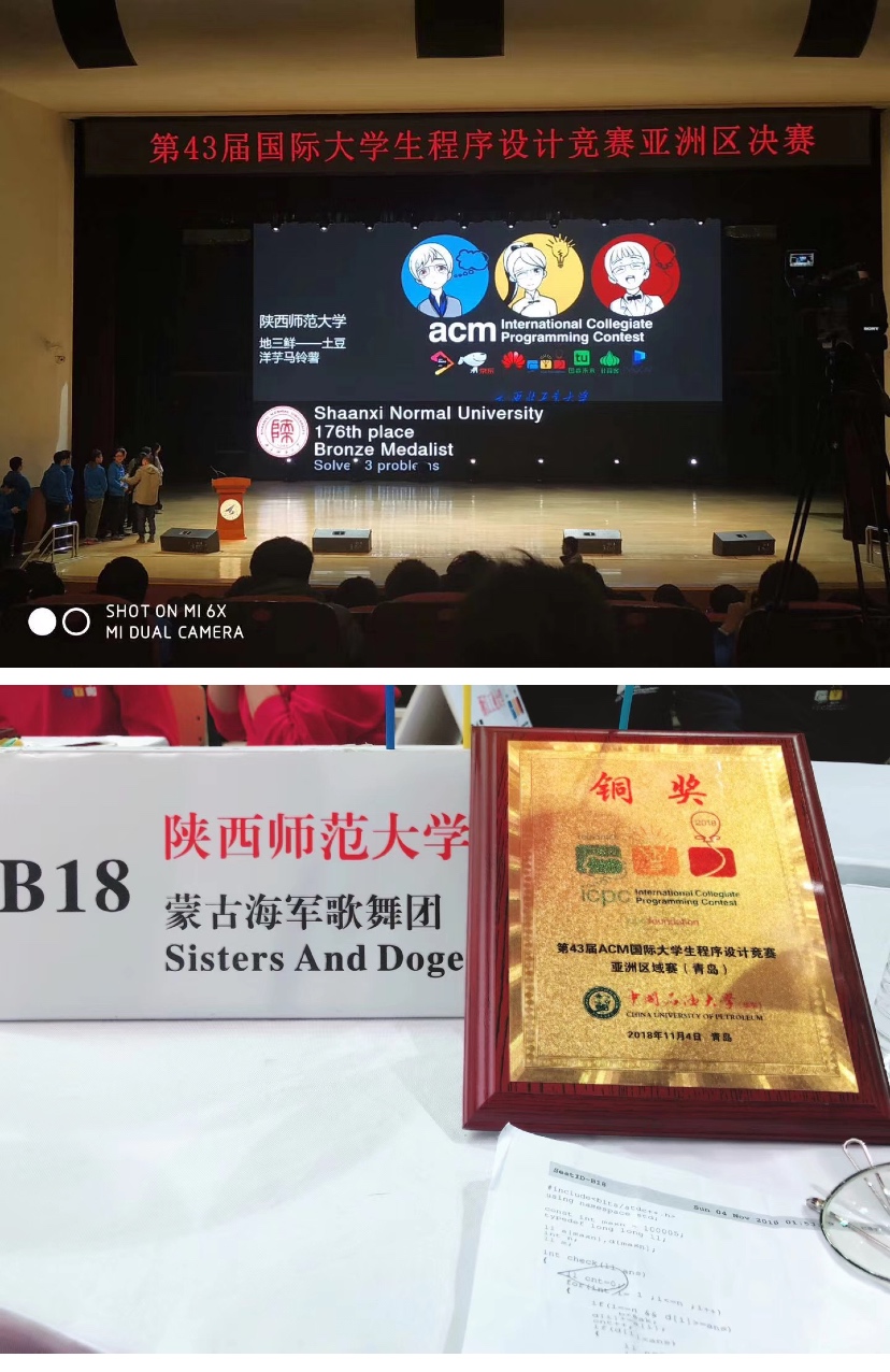 竞赛主要集中在每年 10 月到12月的ICPC(国际大学生程序设计竞赛)与CCPC(中国大学生程序设计竞赛)相关系列比赛。在大二上学期的十月前后,我与两位学长组队参赛,并且获得了国际大学生程序设计竞赛亚洲区域赛的铜奖两枚,并憧憬大三能再创新高,然而甘瓜苦蒂,大三依然是两枚铜奖。