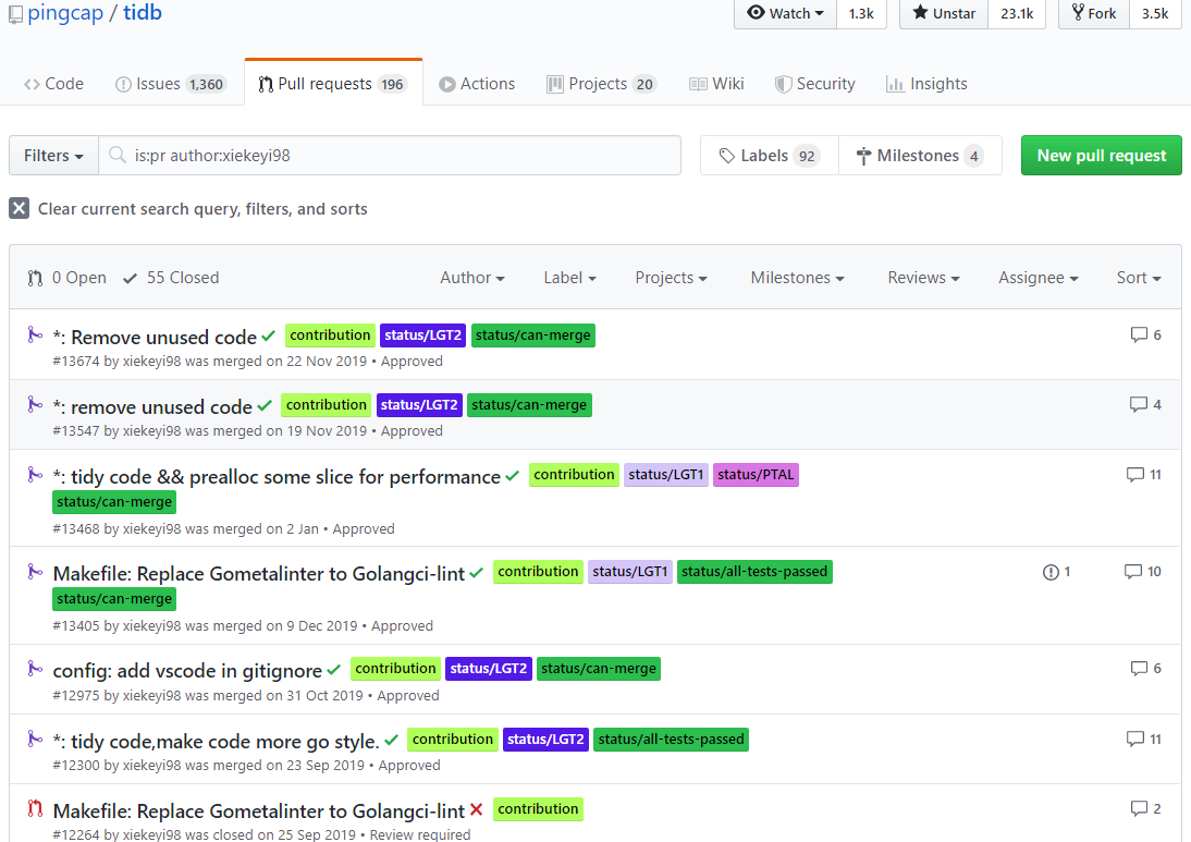 最终拿到了扇贝和 PingCAP的 offer,入职了 PingCAP。PingCAP 主营 TiDB,一款开源在 Github 上的数据库。在这个过程中,熟练了Git 的用法,并了解了开源社区运作方式。PingCAP的企业文化也很培养人,在里面我得到了很多帮助和指导。