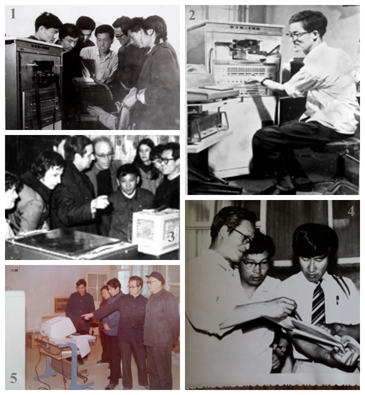 图1:主要研制专家之一曹豫莪教授(右三)指导学生使用DJS130计算机